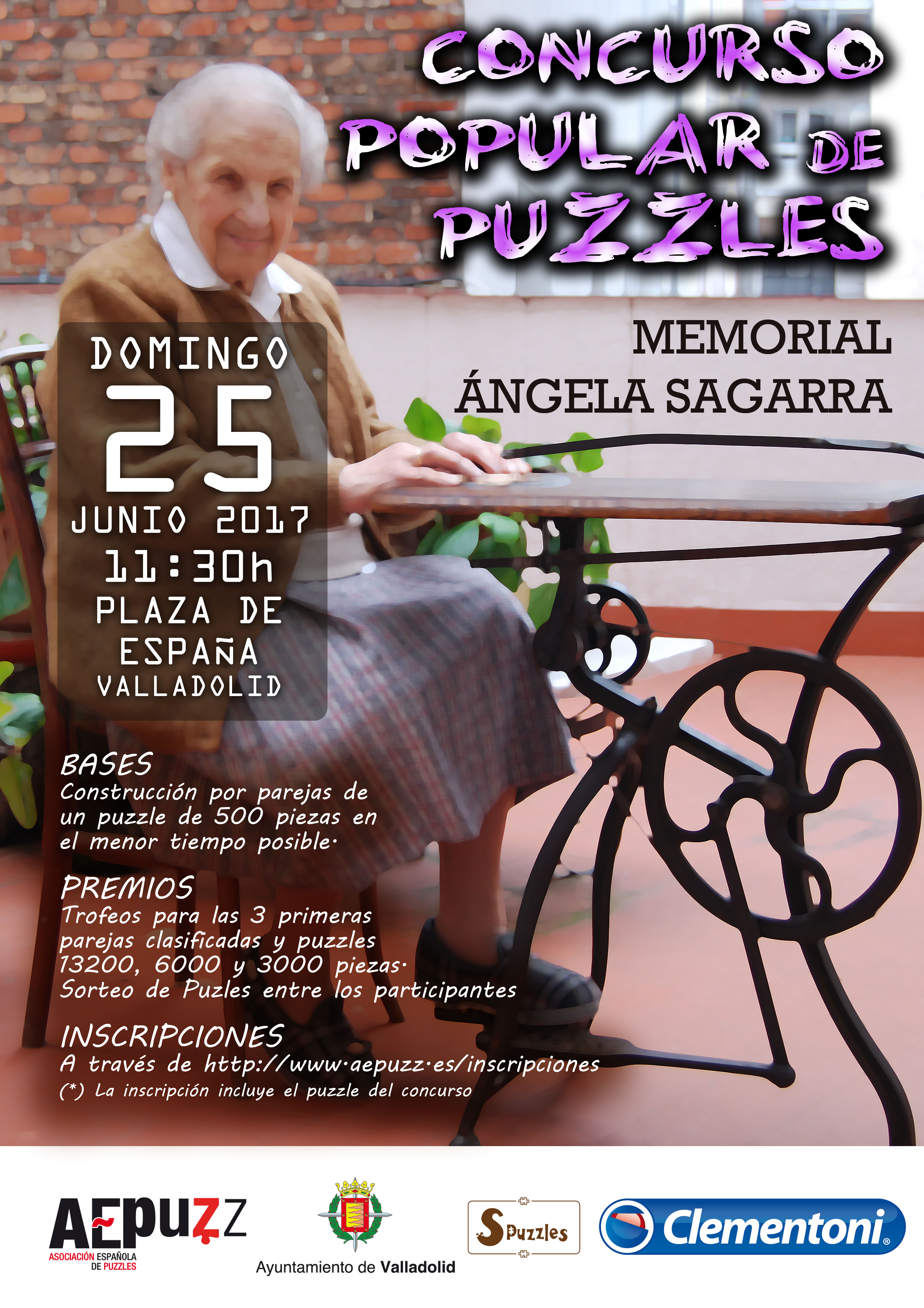 Memorial Ángela Sagarra. Así se denominará el primer concurso de puzles al aire libre que tendrá lugar en Valladolid el próximo 25 de junio, a partir de las 11:30 horas, en la Plaza de España. El lugar en el que se rendirá homenaje a una de las mayores aficionadas...- Fecha de la noticia