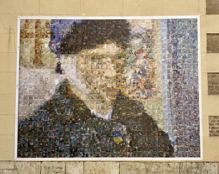 La fachada exterior de la entrada de la iglesia de Las Francesas luce el mosaico en gran formato realizado con las imágenes enviadas por los ciudadanos durante la exposición ‘La habitación de Van Gogh’, que acogió la Sala Municipal de La Pasión entre noviembre...