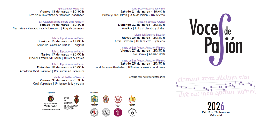 La Fundación Municipal de Cultura (FMC) de Valladolid anticipa la Semana Santa con una nueva edición de Voces de Pasión, programa que este año ofrecerá 11 actuaciones musicales, todas de entrada libre hasta completar el aforo, desde el viernes 13 de marzo y...