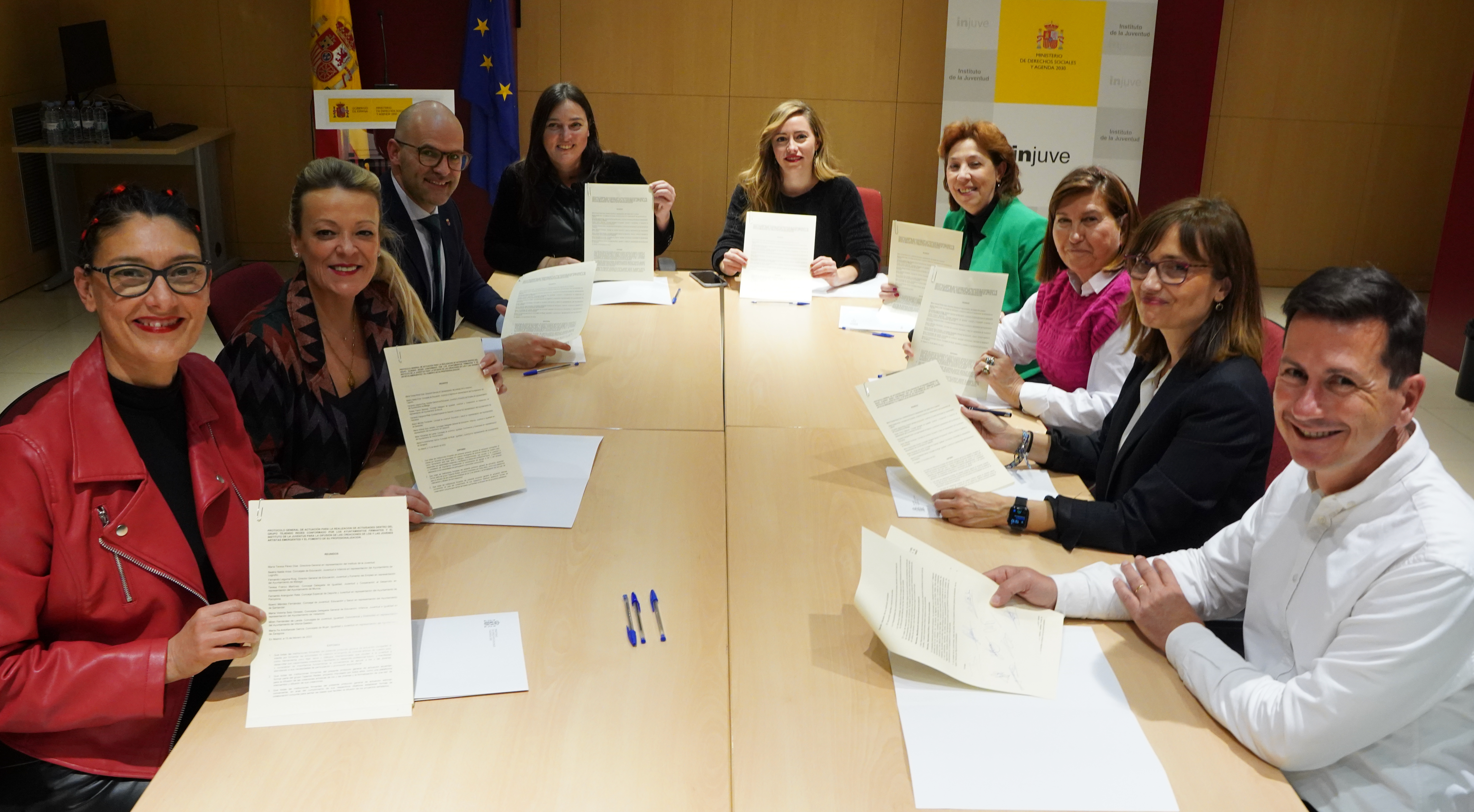 La sede en Madrid del Instituto de la Juventud (Injuve) ha sido el lugar elegido para firmar el acuerdo con los ayuntamientos de Logroño, Málaga, Murcia, Pamplona, Santander, Valladolid, Vitoria-Gasteiz y Zaragoza con el objetivo de poner en marcha el proyecto Tejiendo Redes, una iniciativa que pretende convertirse en plataforma abierta para la difusión de las creaciones artísticas de los y las jóvenes y la formalización de una red de intercambio y difusión de sus obras.