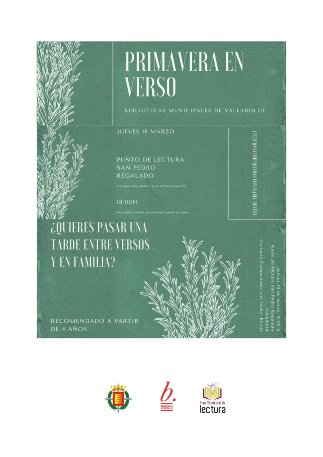 Con el lema "Primavera en verso" invita a toda la ciudadanía a llenar oídos y calles de versos o poemas. Pueden ser creaciones propias o versos que os gusten.