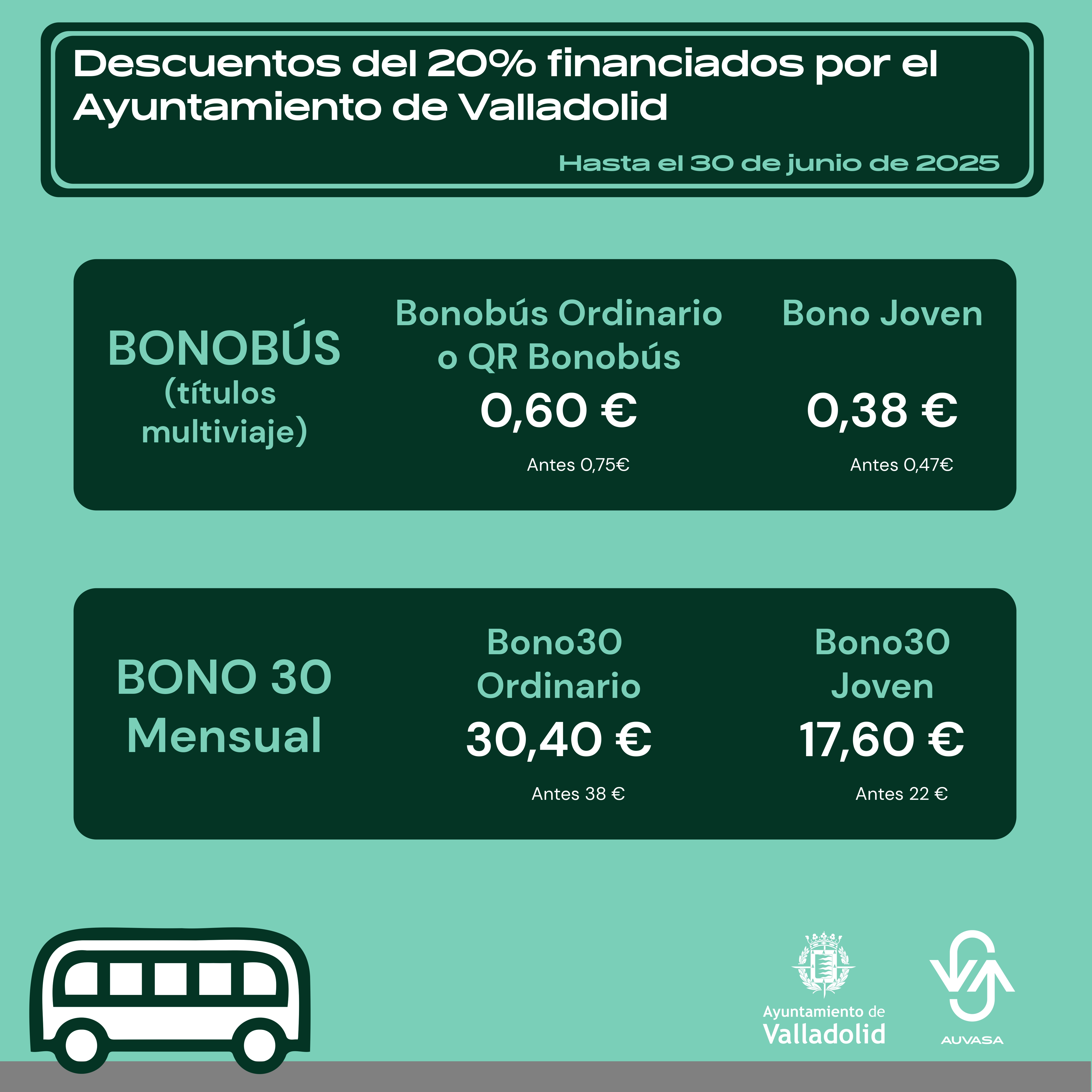 El Ayuntamiento de Valladolid, ha dado traslado a AUVASA del Acuerdo de la Junta de Gobierno Local para que aplique la nueva situación de las bonificaciones a partir de mañana 28 de enero, una vez conocida la eliminación de la aportación del Estado. En consecuencia, se continuará con la bonificación del Ayuntamiento de Valladolid del 20%, como venía haciendo desde el 1 de enero de este año.