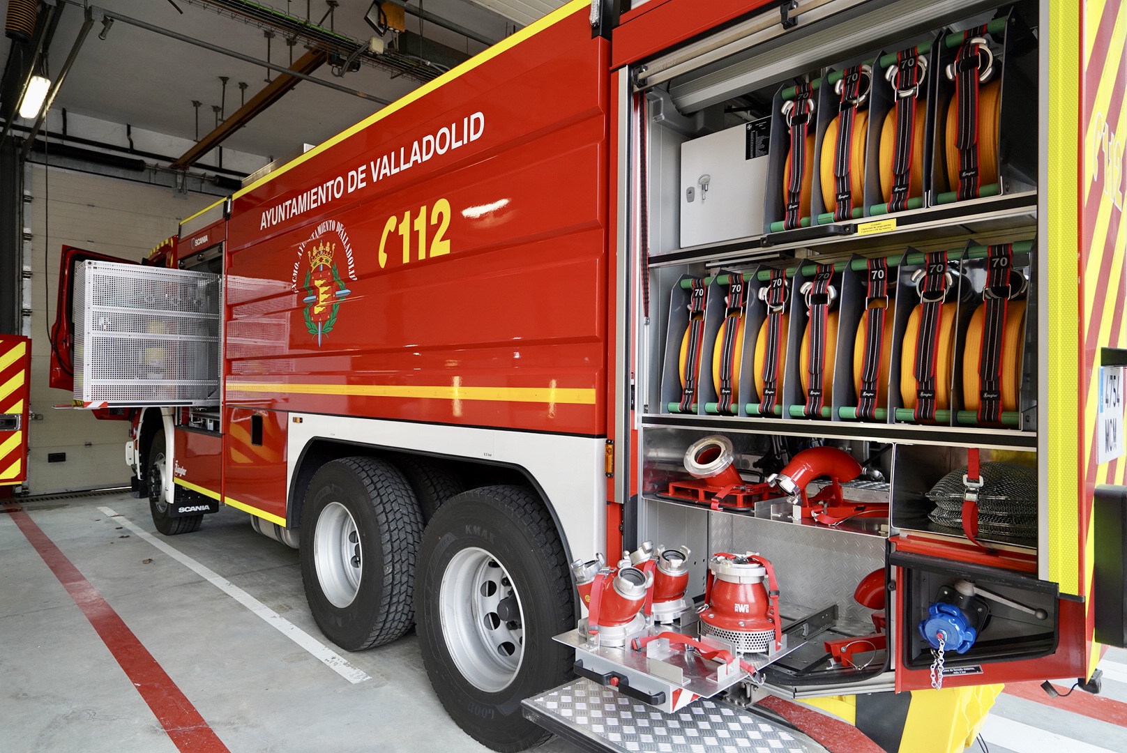 El nuevo camión del Servicio de Bomberos, con capacidad para 11.500 litros de agua y dotado con la última tecnología, convierte a Valladolid en la única ciudad del país con este tipo de vehículos. Así lo han confirmado los responsables de la empresa adjudicataria en la presentación de los nuevos medios. Es uno de los nuevos medios que el alcalde, Óscar Puente, ha presentado en el Parque de Las Eras, acompañado por el concejal de Salud Pública y Seguridad Ciudadana, Albero Palomino, y el jefe del Servicio de Extinción de Incendios, Salvamento y Protección Civil del Ayuntamiento de Valladolid, Javier Reinoso.