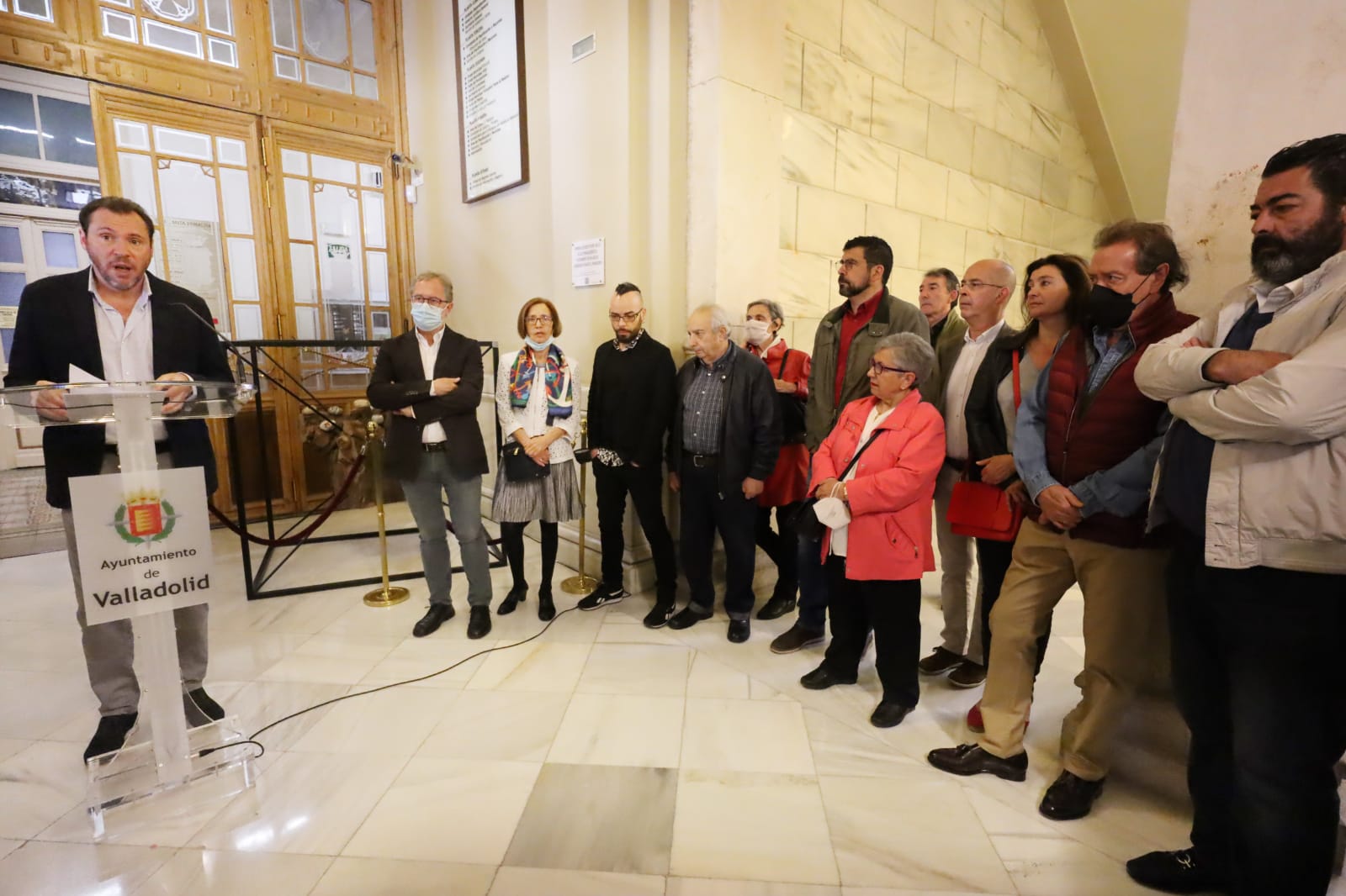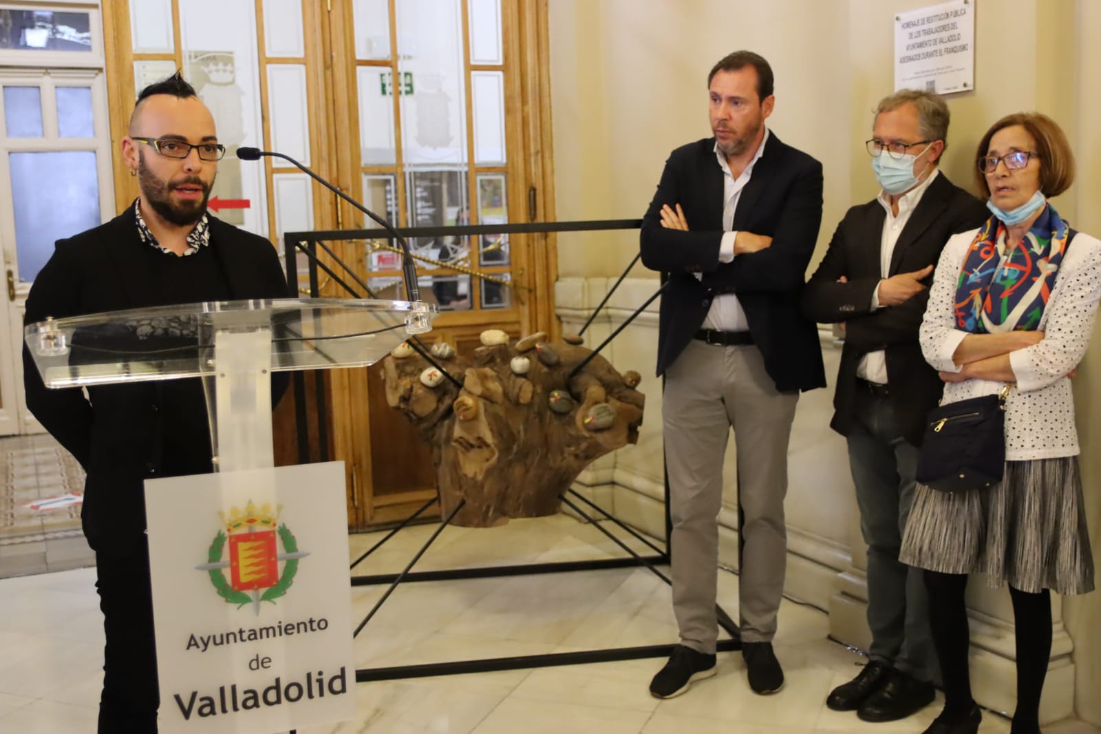 "Hoy, 1 de mayo, el día de los trabajadores y las trabajadoras, el Ayuntamiento de Valladolid tributa un homenaje a los y las empleadas municipales que sufrieron represión a raíz de aquel golpe de Estado, de la Guerra Civil y de la dictadura franquista, homenaje que se hace extensivo a todas las personas trabajadoras de nuestra ciudad que fueron represaliados en aquellos aciagos episodios de la historia de España. Se da con ello cumplimiento a la moción aprobada por el pleno de la Corporación Municipal, celebrado el pasado 5 de abril, "para la restitución pública del personal trabajador del Ayuntamiento de Valladolid represaliado durante el franquismo", que contó con el respaldo de los Grupos Municipales Socialista, Popular, Ciudadanos y Valladolid Toma la Palabra" ha señalado durante su intervención el alcalde, que ha continuado explicando que "de la investigación anteriormente mencionada se desprende, sin perjuicio de que el listado pueda verse incrementado a partir de futuros estudios, que 21 trabajadores municipales fueron asesinados; de ellos,16 fueron ejecutados de manera extrajudicial sin mediar juicio, dos murieron en la cárcel y tres fueron fusilados tras sentencias judiciales. Además, 55 personas pertenecientes a la plantilla municipal sufrieron pena de cárcel y 144 diversas sanciones, que iban desde la destitución a la suspensión de empleo y sueldo. Según los datos que aportan Izquierdo y Rodríguez, 238 personas de la plantilla del Ayuntamiento de Valladolid en 1936, que ascendía a 952 personas, sufrieron expedientes de depuración".