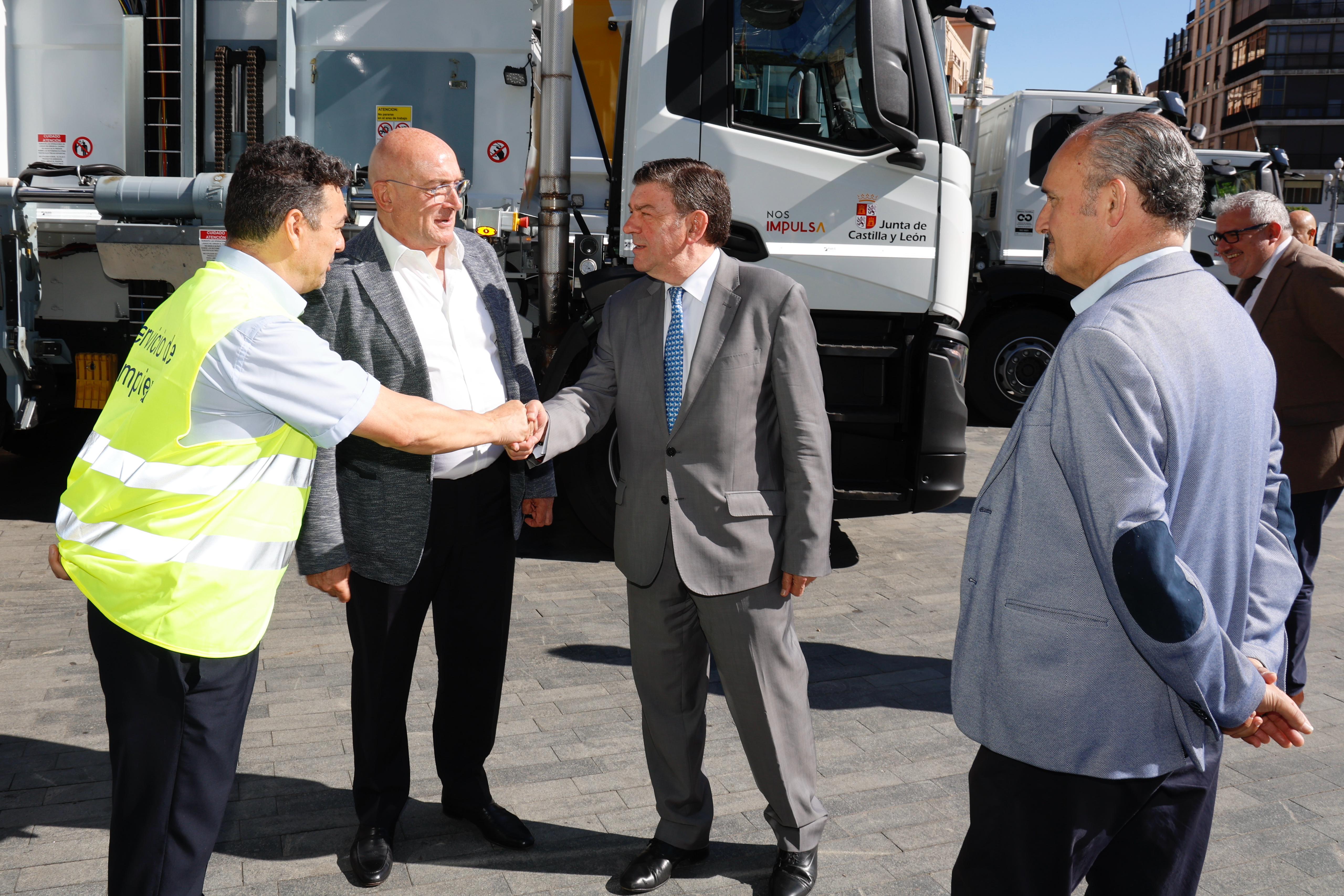 El consejero de la Presidencia de la Junta de Castilla y León, Luis Miguel González Gago, y el alcalde de Valladolid, Jesús Julio Carnero, han presentado cuatro nuevos camiones destinados a la recogida de residuos, que han supuesto una inversión de 1.120.562 euros y que se incorporarán al Servicio Municipal de Limpieza de la ciudad. La Junta ha financiado estas adquisiciones a través de la Cooperación Económica Local General de 2023 en más de un 80%.