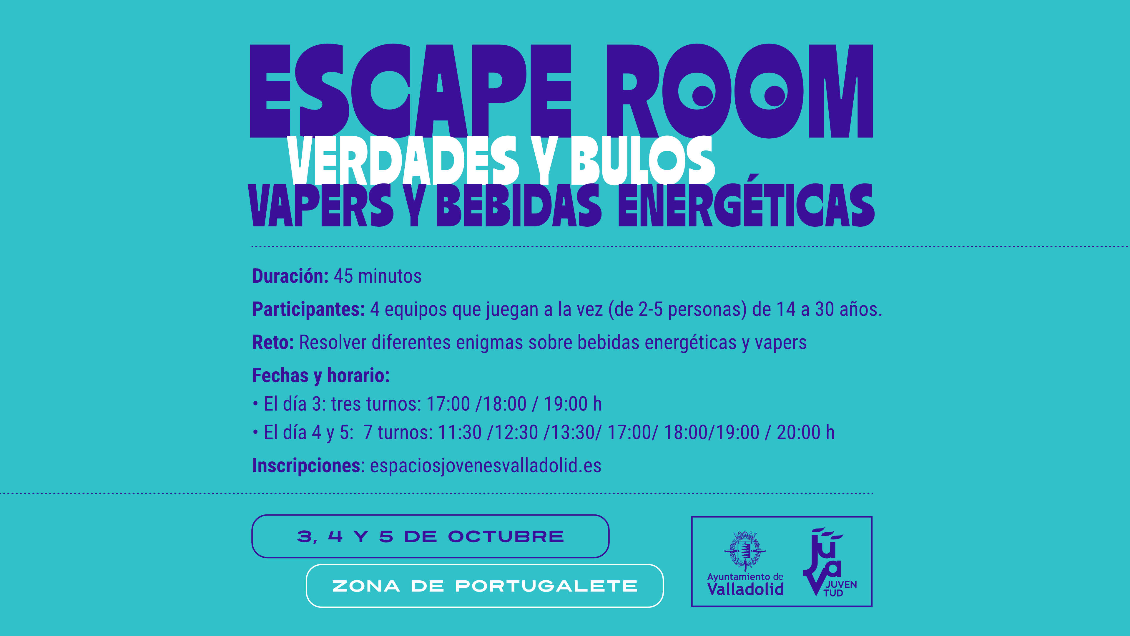 - Escape Room temático. Una experiencia lúdica y educativa en la que los participantes deberán resolver enigmas sobre mitos y realidades en torno a vapeadores y bebidas energéticas. Se celebrará en la Plaza de Portugalete, los días 3, 4 y 5 de octubre, con un máximo de 20 participantes por turno.