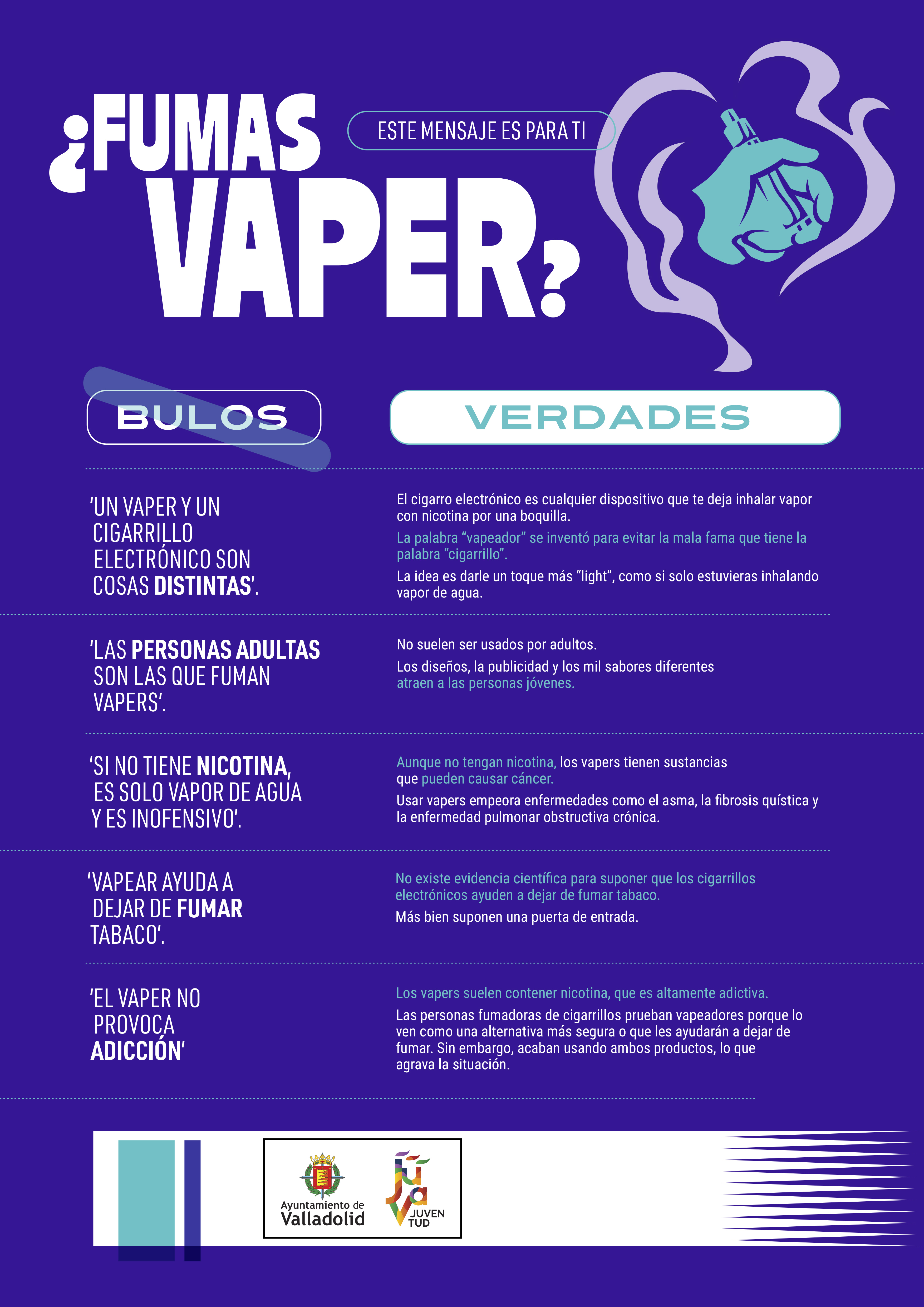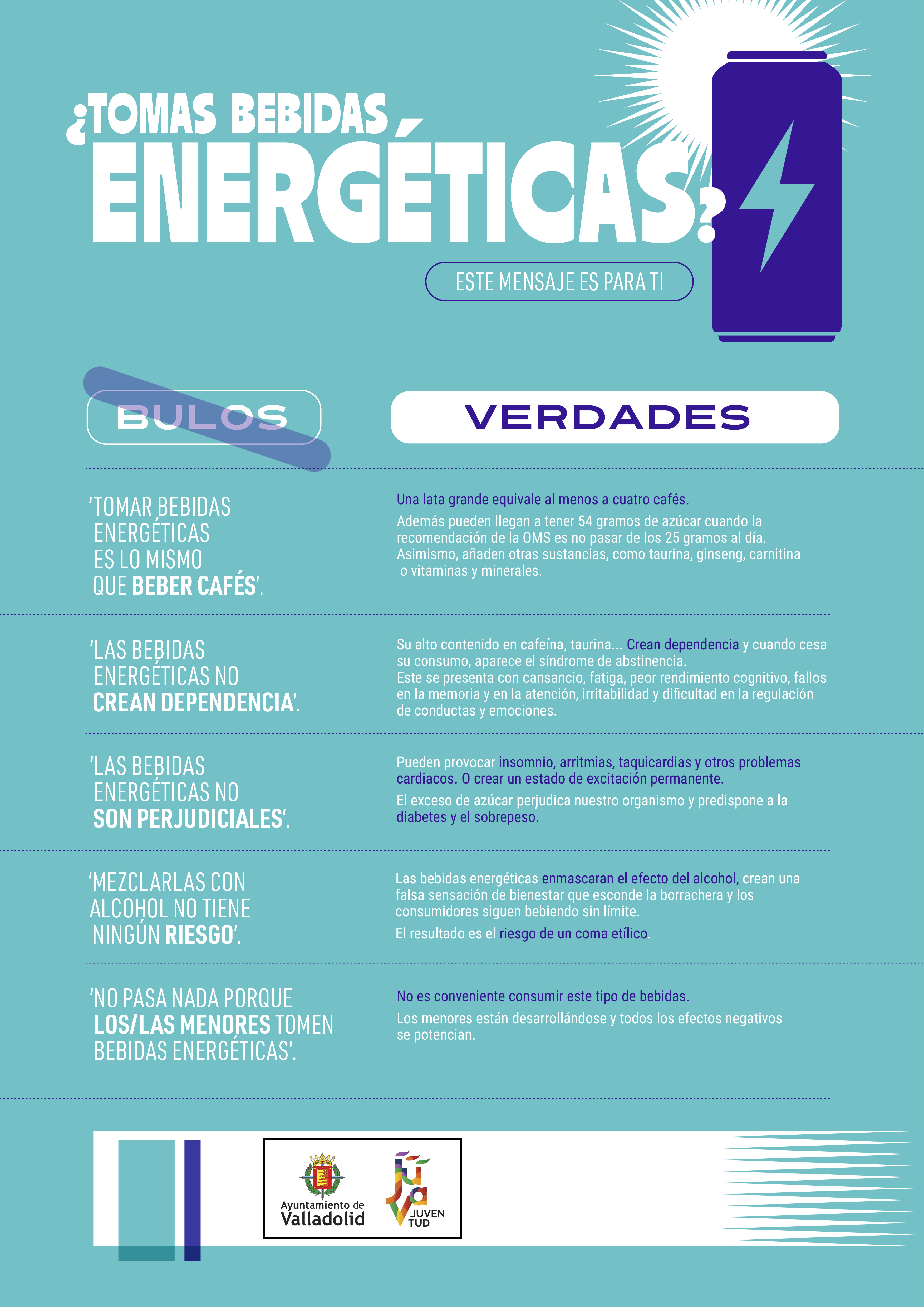 - Campaña de sensibilización sobre bebidas energéticas y vapeadores. Se han elaborado infografías que desmienten bulos y presentan información veraz, distribuyéndose en centros educativos de ESO, Bachillerato y Ciclos Formativos, así como en bibliotecas, CEAS, centros cívicos, polideportivos de la Fundación Municipal de Deportes y los Espacios Jóvenes de la ciudad.