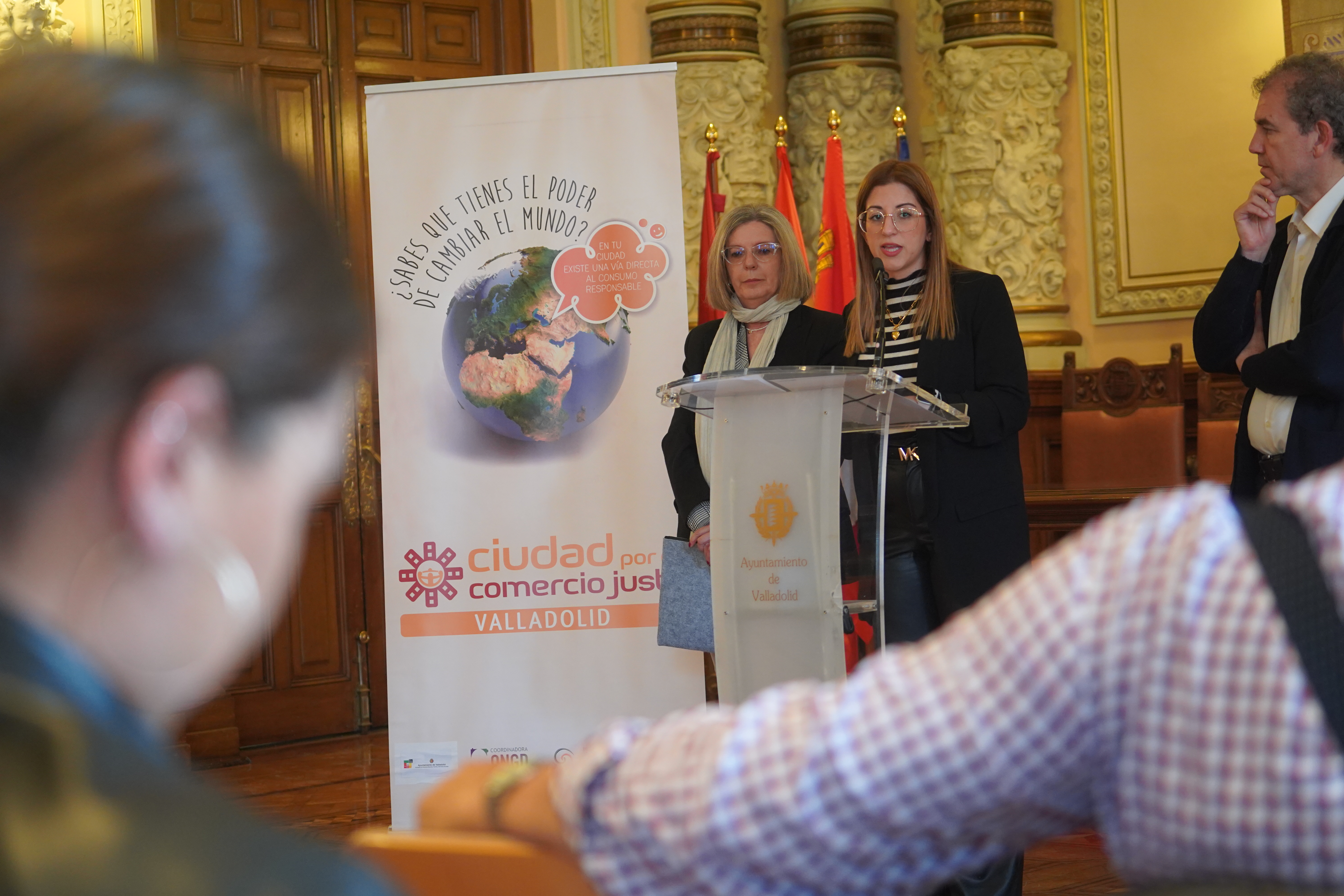 La concejala de Juventud, Carolina del Bosque, ha presentado hoy en la Casa Consistorial las actividades organizadas para celebrar el Día Mundial del Comercio Justo, que se conmemora el segundo sábado del mes de mayo, y que coincide en esta ocasión con el día 11 del presente mes. Ha estado acompañada por María del Rosario Rivero Martín, técnico de Cooperación Internacional para el Desarrollo de la Universidad de Valladolid, y por Jesús Gómez Pérez, en representación de la Plataforma Vallisoletana de Comercio Justo de la Coordinadora de ONGD de Castilla y León.