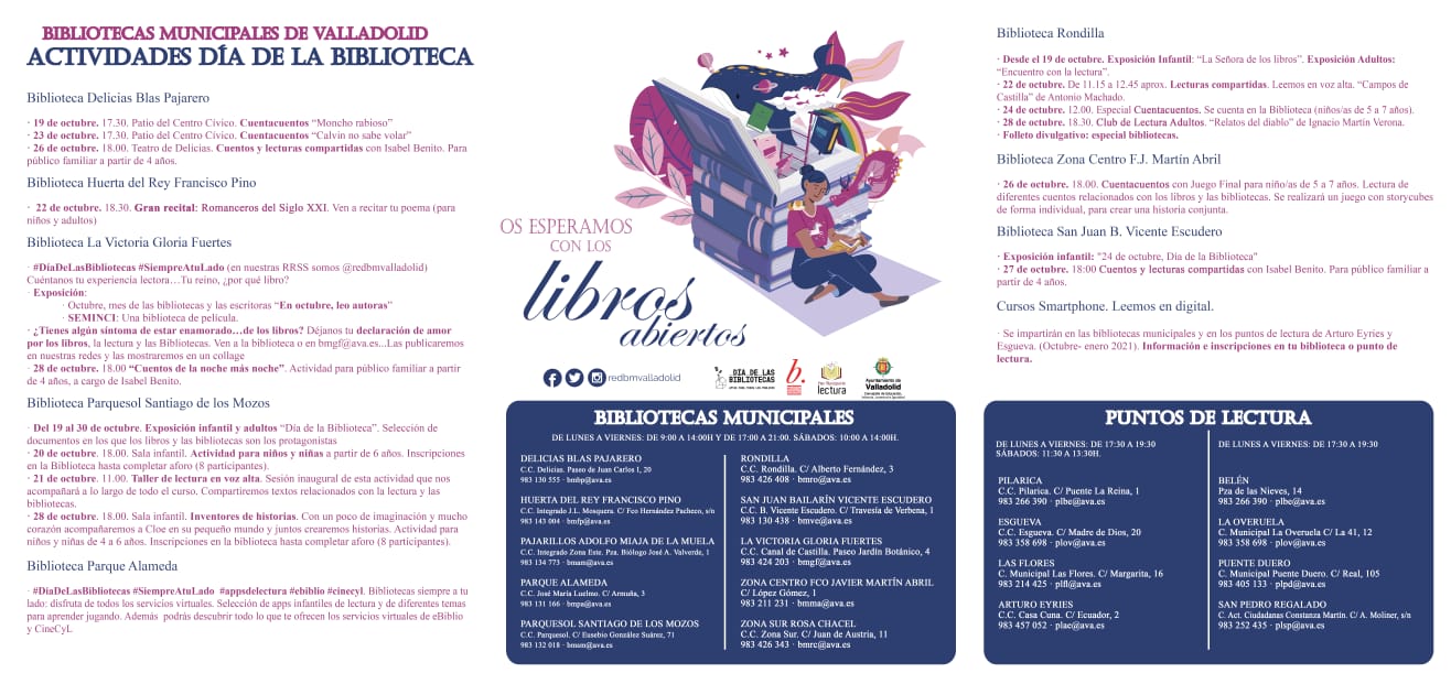 Para celebrar este día, las Bibliotecas Municipales de Valladolid, que dependen de la Concejalía de Educación, Infancia, Juventud e Igualdad, han elaborado un cartel conmemorativo con el lema "Os esperamos con los libros abiertos" y un programa de actividades que se encuentra disponible en las propias bibliotecas municipales, puntos de lectura, centros cívicos y otros espacios públicos, y que también se difundirá a través de la RRSS y la web municipal.