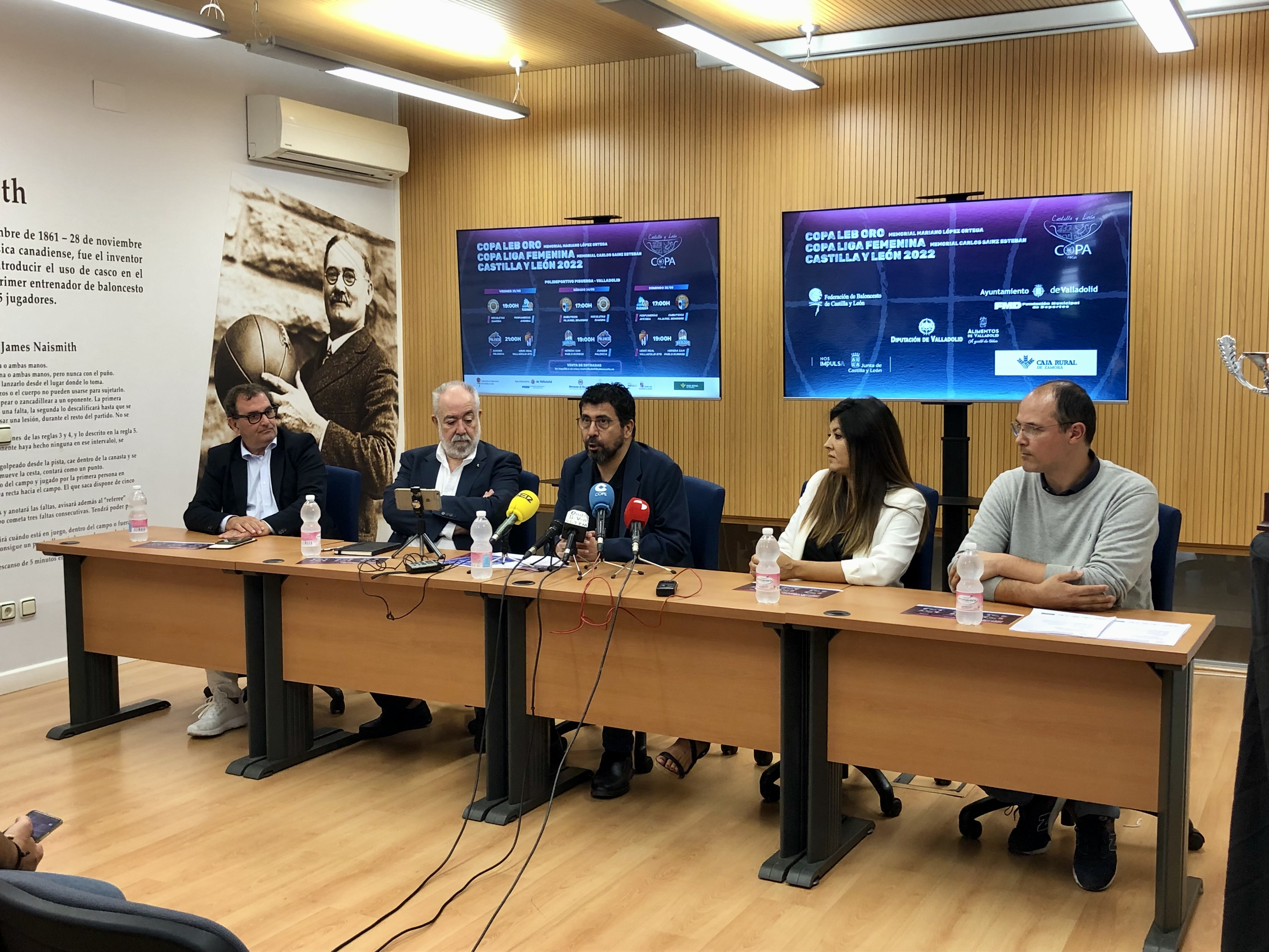 El concejal de Participación Ciudadana y Deportes, Alberto Bustos, ha presentado la Copa CyL LEB y Liga Femenina en la sede de la Federación de Baloncesto de Castilla y León. junto con el presidente de FBCyL, Óscar Castañeda, el presidente del Real Valladolid Baloncesto, Alejandro García, la diputada de Familia e Igualdad de Oportunidades de la Diputación de Valladolid, Raquel González, y el director de comunicación de Caja Rural de Zamora, Narciso Prieto.