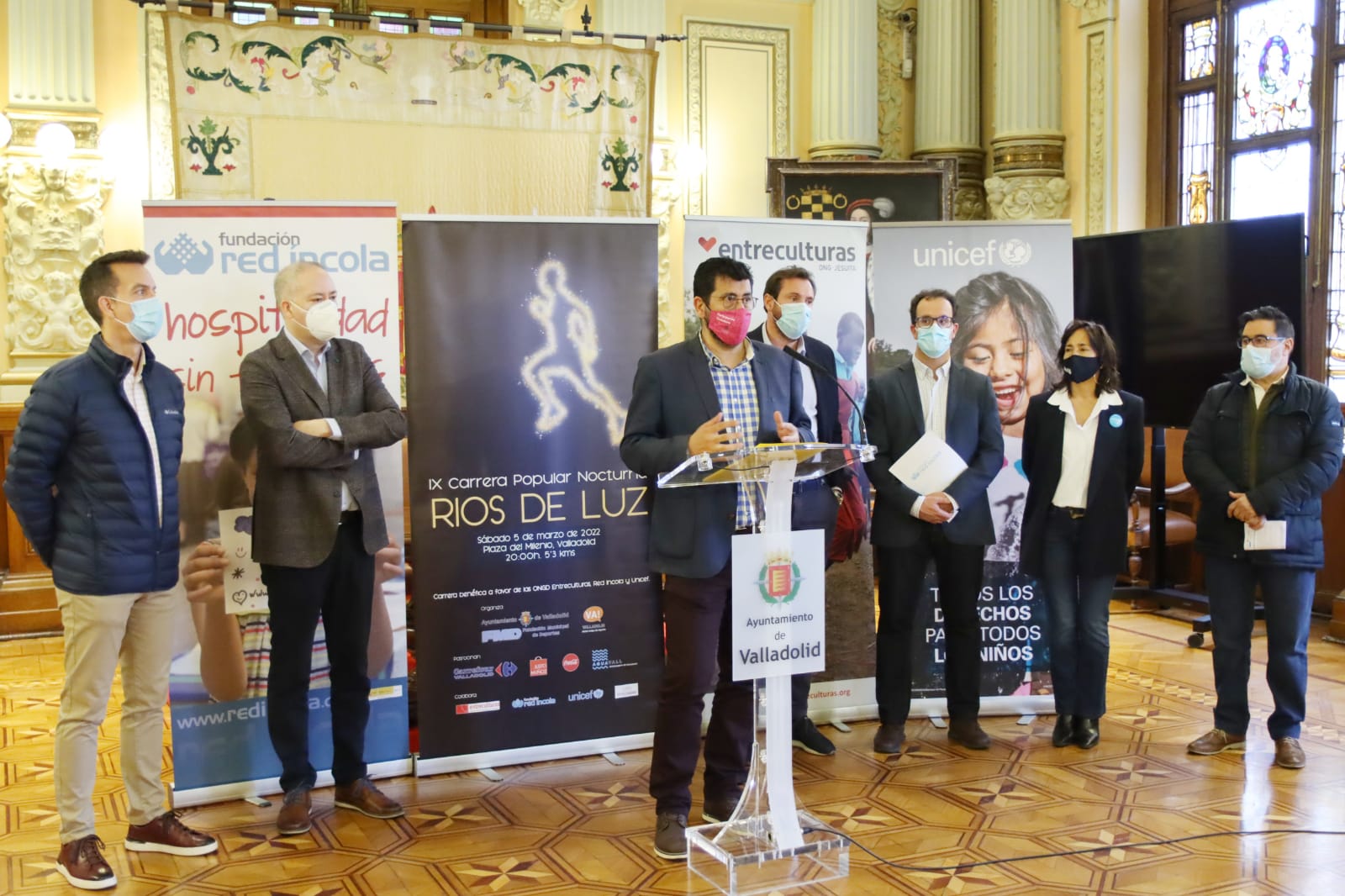 El alcalde, Óscar Puente, y el concejal de Participación Ciudadana y Deportes, Alberto Bustos, han presentado la IX Carrera Popular Nocturna "Ríos de Luz 2022". En el acto han estado acompañados por el delegado en Valladolid de Entreculturas, Juan Antonio Pérez de Andrés, el coordinador de Red Íncola, Eduardo Menchaca, y la presidenta de UNICEF Castilla y León, M.ª Eugenia García Rincón, como representantes de las entidades a las que irá destinada la recaudación del evento. Se han sumado, además, a esta presentación por parte de Atletas Populares, Andrés Hortigüela, y en representación de los patrocinadores de la carrera, Francisco Javier Losa, de Carrefour.