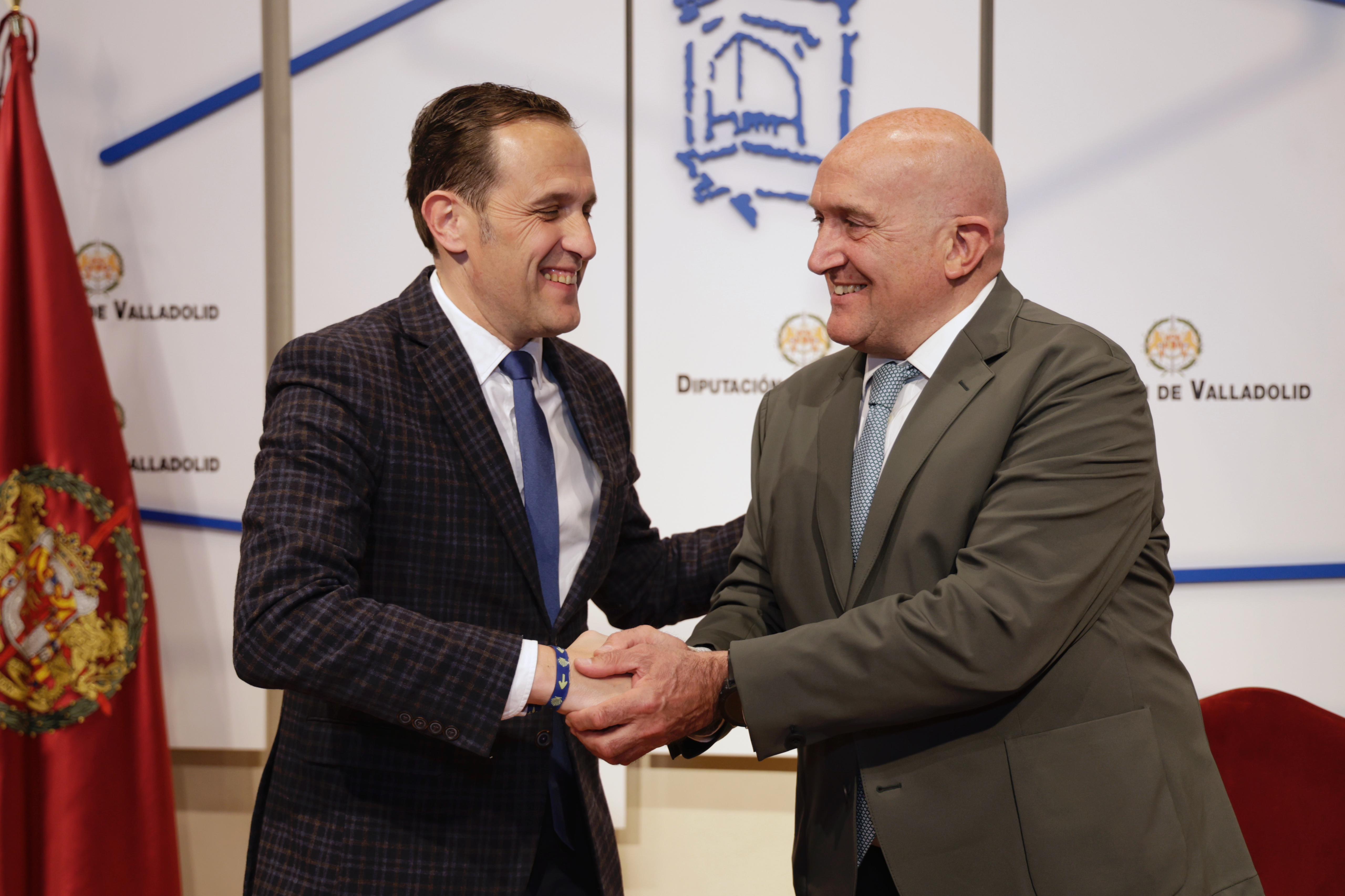 El presidente de la Diputación de Valladolid, Conrado Íscar, y el alcalde de Valladolid, Jesús Julio Carnero han suscrito en el Palacio de Pimentel, lugar de nacimiento del monarca, el Protocolo de Colaboración para la Organización y Celebración conjunta de los Actos Conmemorativos del V Centenario del Nacimiento de Felipe II, que tendrá lugar el 21 de mayo de 2027.