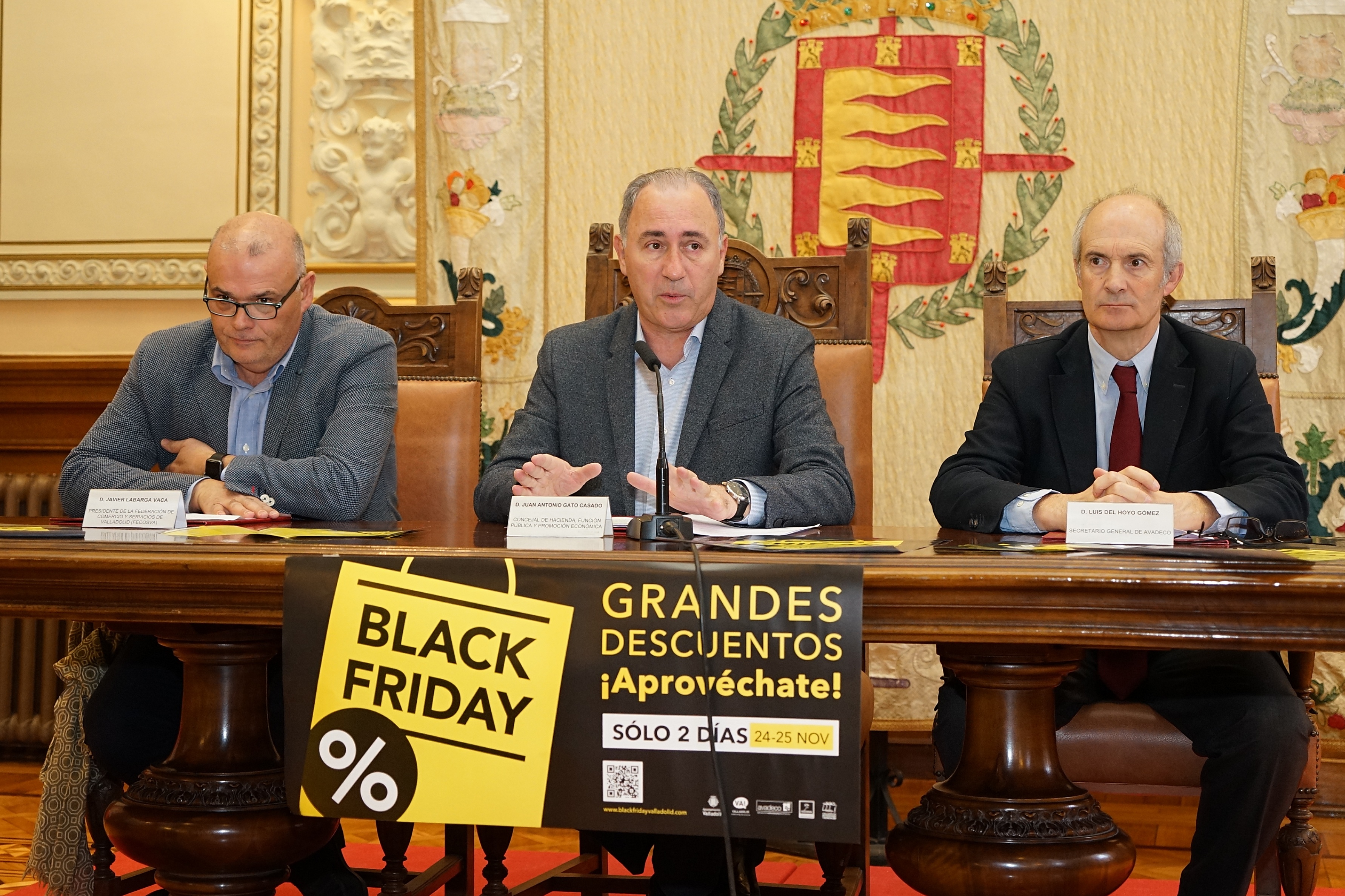 El concejal de Hacienda y Promoción Económica, Antonio Gato; el secretario general de AVADECO; Luis del Hoyo Gómez, y el presidente de FECOSVA, Javier Labarga, presentaron este jueves la celebración del "Black Friday" en el comercio de proximidad de Valladolid, iniciativa que cuenta con el respaldo del Ayuntamiento y las dos asociaciones de comerciantes.