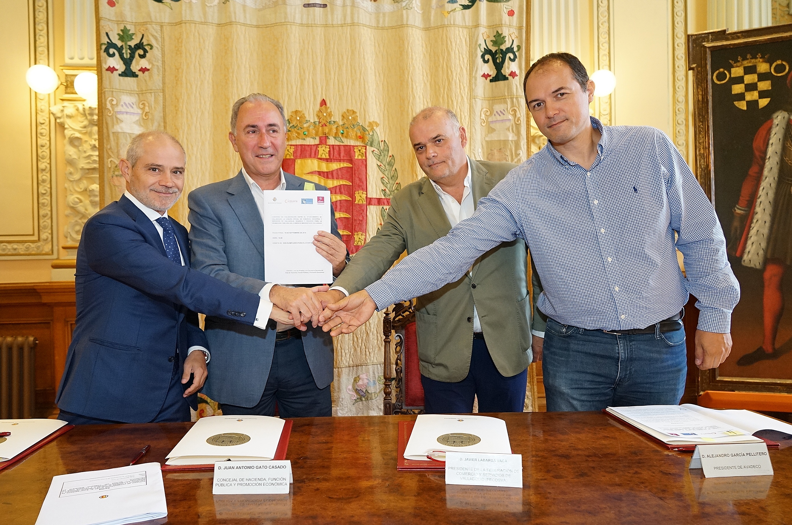 El concejal de Hacienda y Promoción Económica, Antonio Gato, y los presidentes de la Cámara de Comercio, Industria y Servicios de Valladolid, Víctor A. Caramanzana Rey; AVADECO, Alejandro García Pellitero; y FECOSVA, Francisco Javier Labarga Vaca, han firmado esta mañana el convenio de promoción y mejora del pequeño comercio, correspondiente al presente ejercicio.