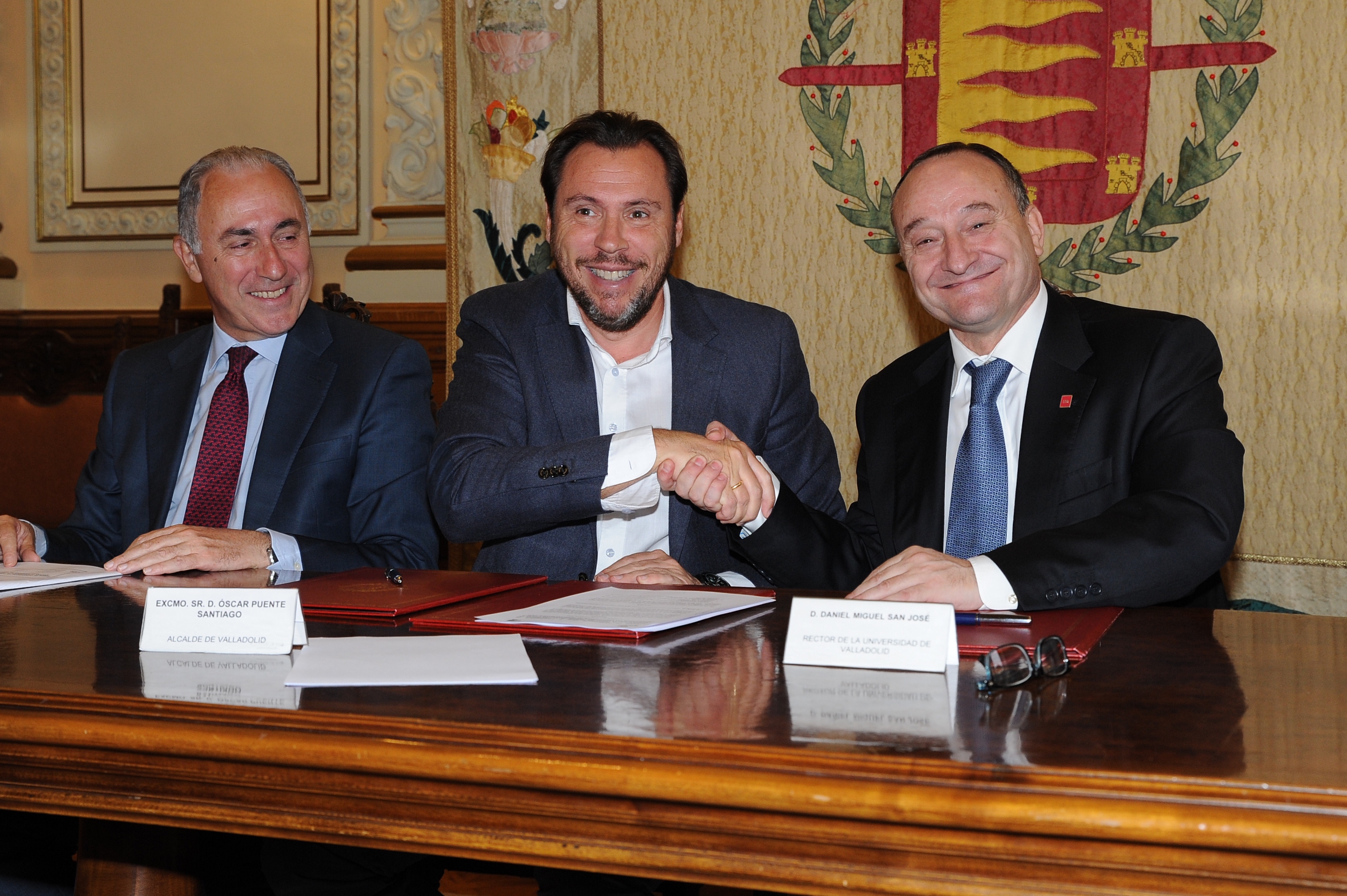 Los acuerdos han sido rubricados por el alcalde, Óscar Puente y el rector de la Universidad de Valladolid, Daniel de Miguel, y han estado presentes en el acto celebrado en la Casa Consistorial el vicerrector de Desarrollo e Innovación Tecnológica, Celedonio Álvarez, y el gerente de la Fundación General de la UVA, José Luis Martínez.