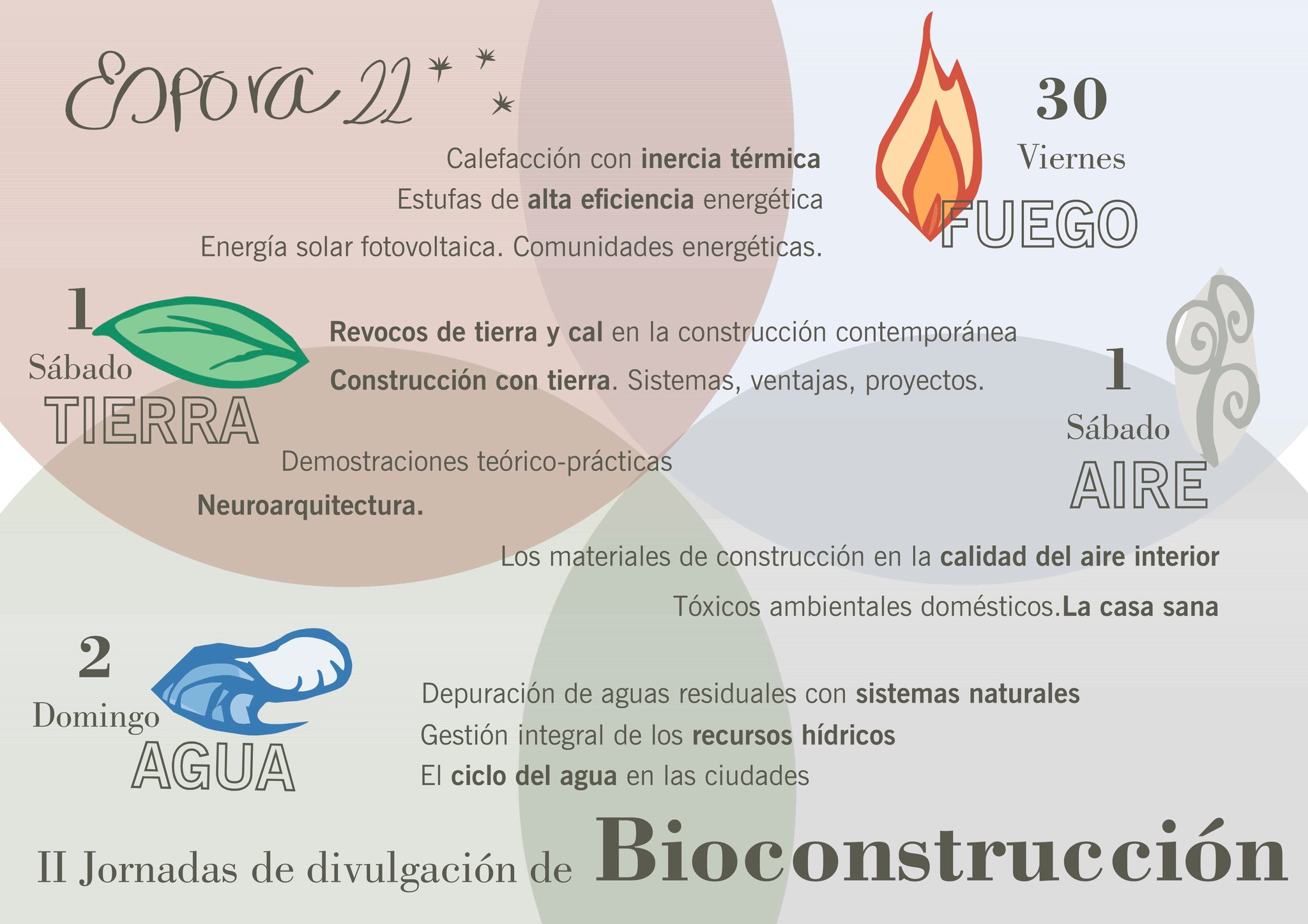 Este año Espora22 se enfoca en los cuatro elementos de la naturaleza, de forma que el viernes 30, con la referencia del fuego, se hablará de calefacción y de energía sostenible. El sábado 1 habrá un primer bloque dedicado a la tierra y a la construcción con este material y un segundo bloque centrado en la calidad del aire en el interior de los edificios. Las charlas del domingo 2 harán referencia a la gestión eficiente del agua, así como su depuración, recuperación y reaprovechamiento. Estos temas se complementarán con otros de mucha actualidad como la neuroarquitectura con la experta Ana Mombiedro o la construcción con bambú con el arquitecto Francesco Intrieri.