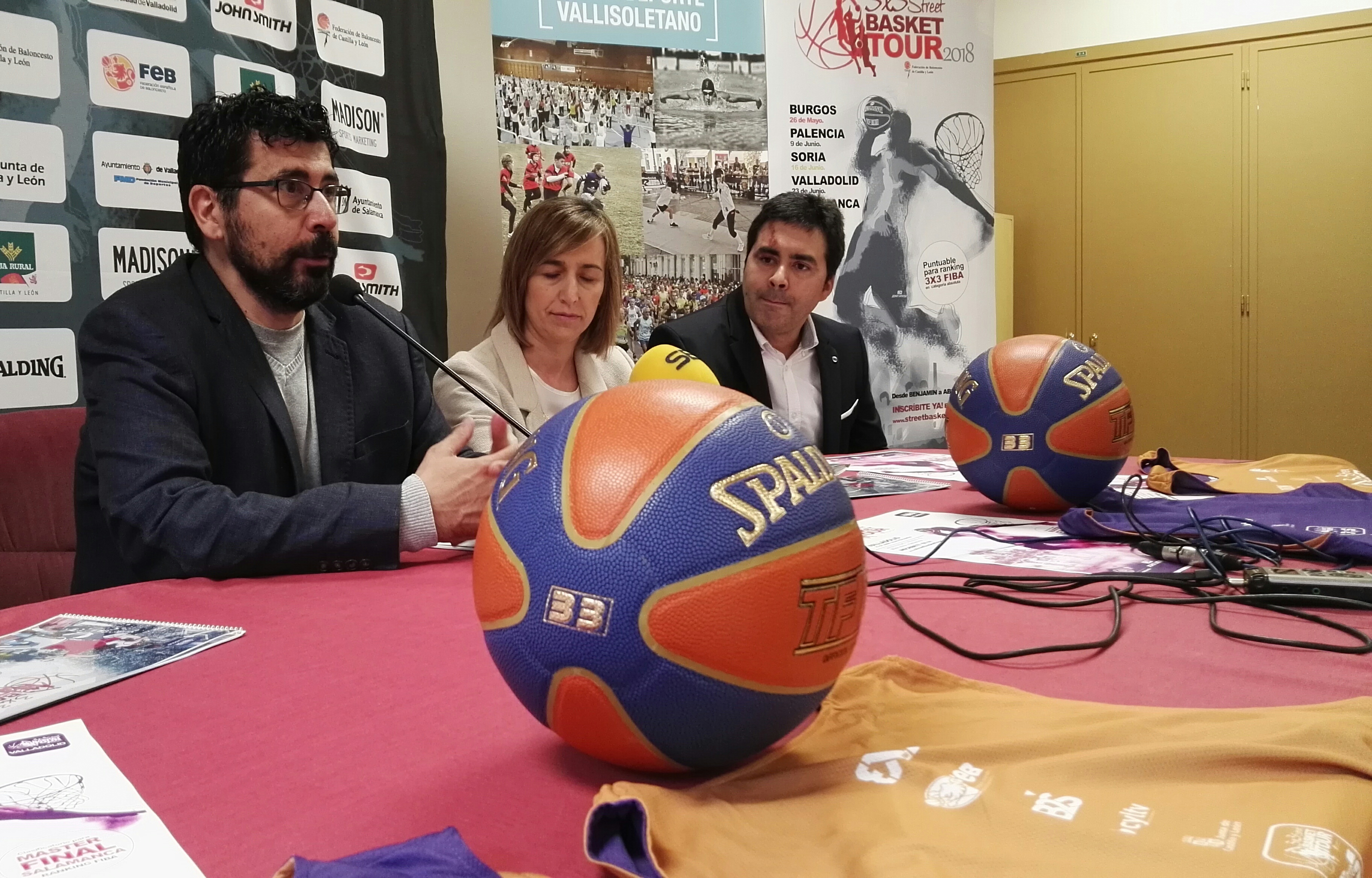 El concejal de Deportes, Alberto Bustos, el representante de Madison, Luis García, el director de Deportes de la UVa, Antonio Blázquez, la representante de Caja Rural Zamora, Paloma Villar y, Luis Martín Moratinos, presidente de la Delegación de Baloncesto de Valladolid, han presentado la 3x3 Street Basket Tour que celebrará una de las fases locales en Valladolid, el día 23 de junio, en la Acera de Recoletos y durante más de 10 horas ininterrumpidas.