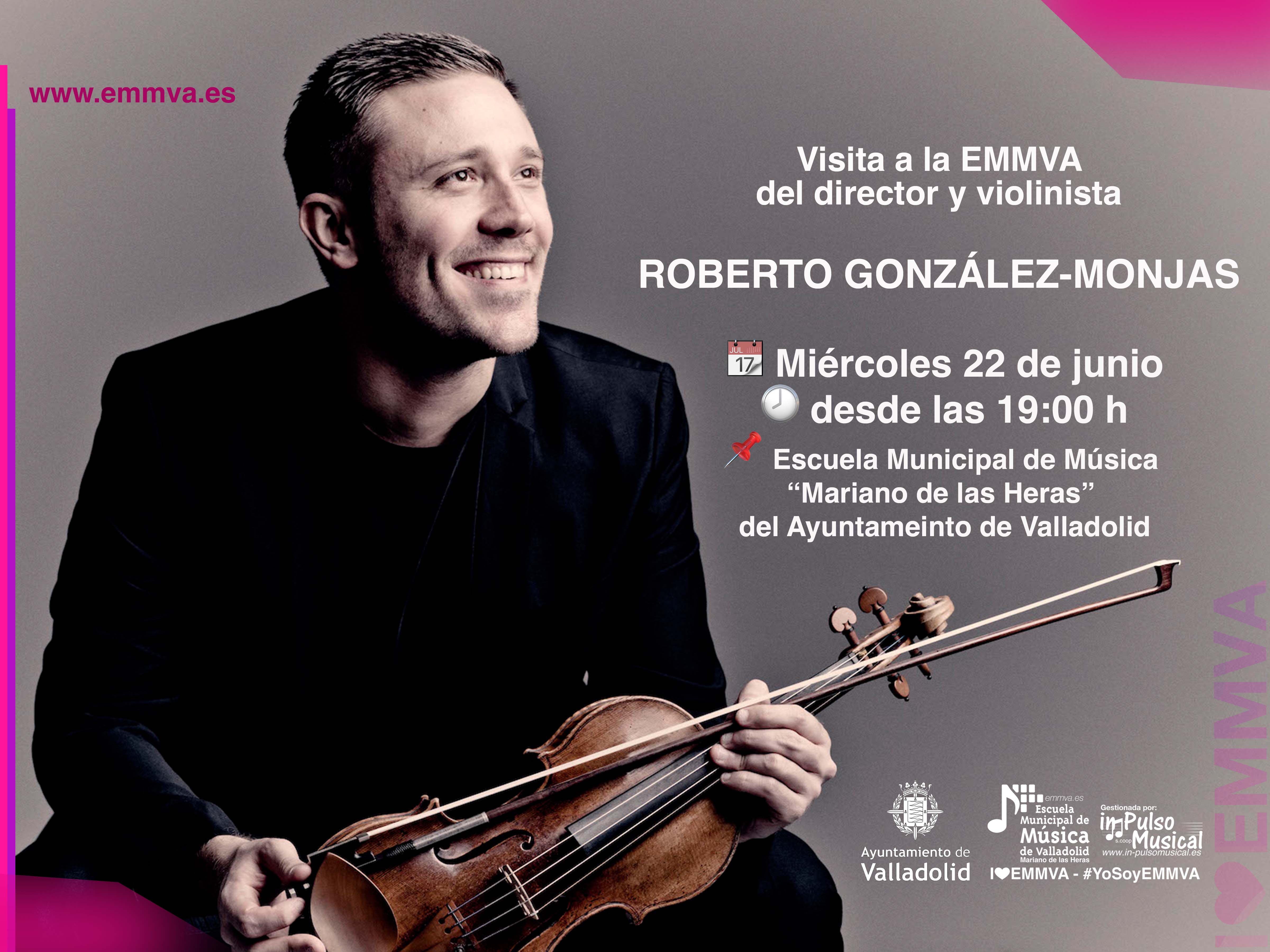 El director de orquesta e intérprete violinista Roberto González - Monjas, ha realizado una visita a la Escuela Municipal de Música "Mariano de las Heras" del Ayuntamiento de Valladolid acompañado por la concejala de Educación, Infancia, Juventud e Igualdad, María Victoria Soto, el concejal de Salud Pública y Seguridad Ciudadana, Alberto Palomino, y el concejal Antonio Otero, además del director de la EMMVA, Francisco Javier Alonso Zarzoso. Durante su estancia, ha podido conocer en primera persona el trabajo que se realiza en la Escuela, así como recorrer sus instalaciones tanto en el Centro Cívico José Luis Mosquera, como en la ampliación que se ha llevado a cabo en lo que fue el colegio María de Molina.