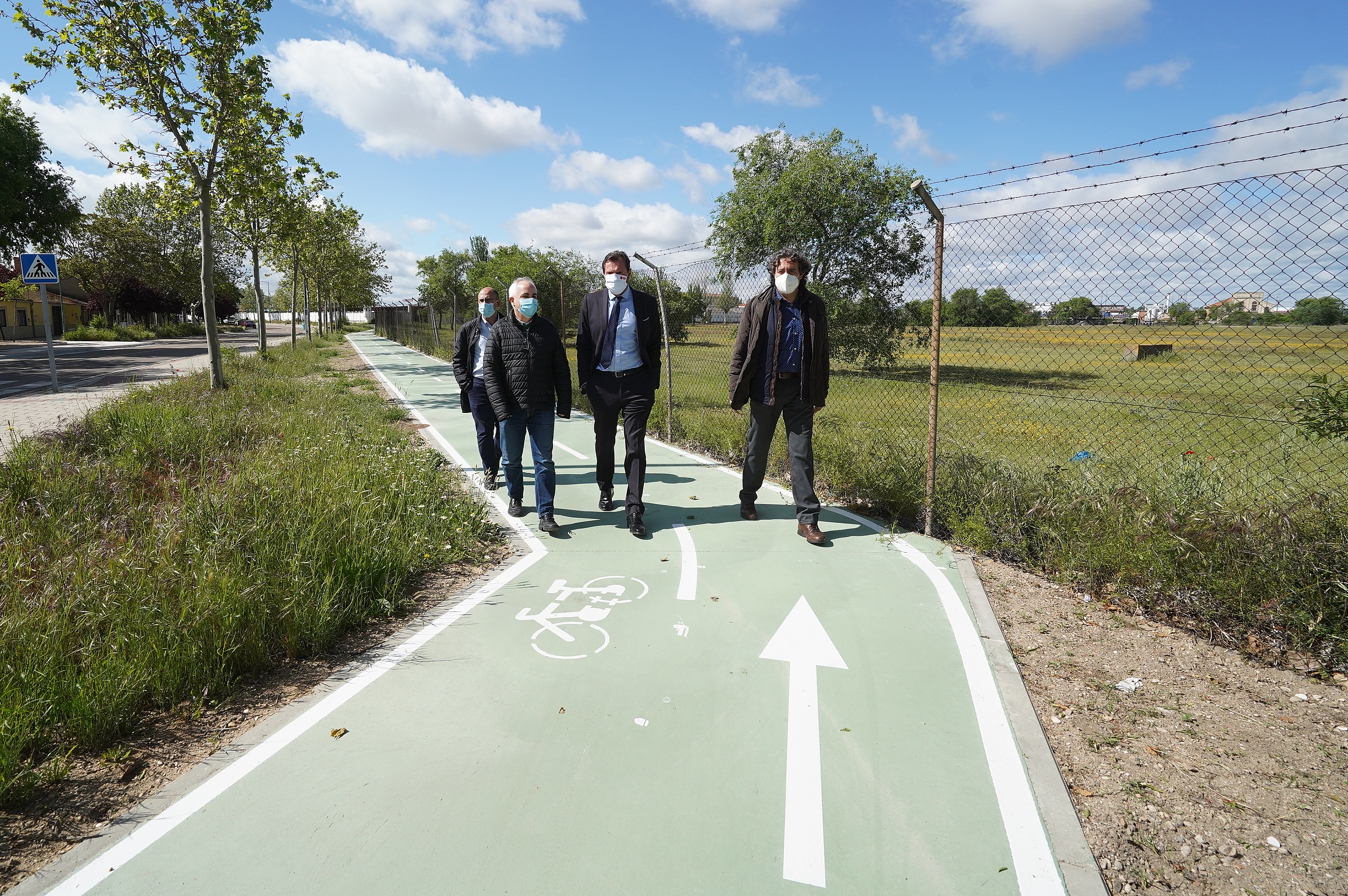 El alcalde de Valladolid, Oscar Puente, junto con el concejal de Movilidad y Espacio Urbano, Luis Vélez, acompañados por técnicos municipales han visitado las obras ejecutadas de un carril bici bidireccional en el Páramo de San Isidro, una intervención aprobada en Presupuestos Participativos, y por tanto votada por los vecinos de la zona.