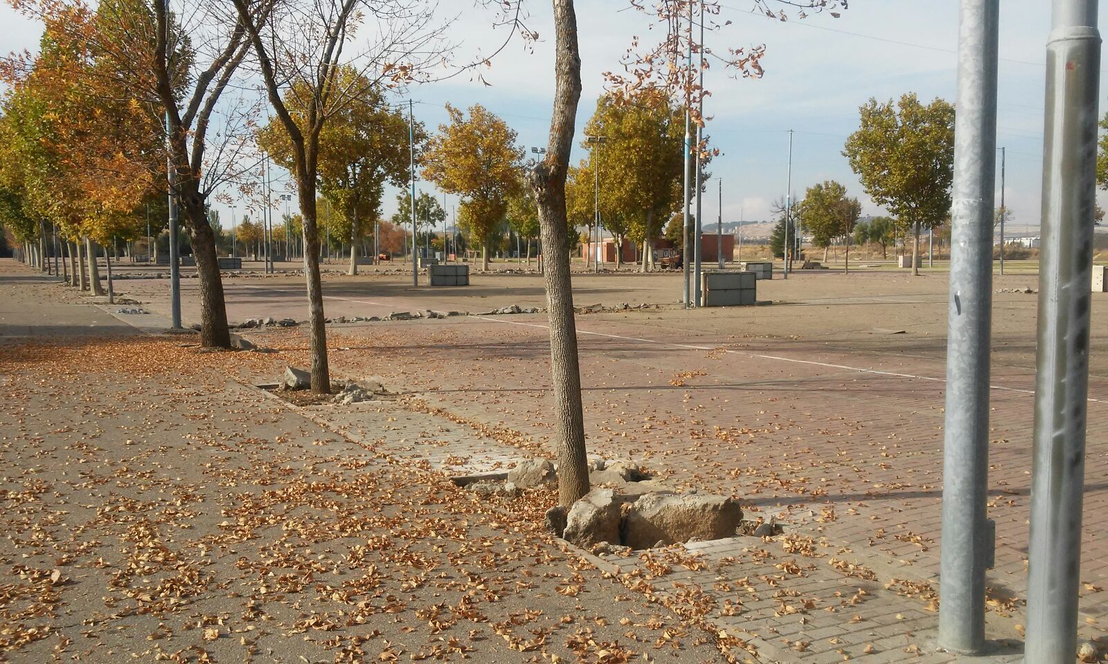 1. Demolición y reposición de pavimentos dañados (levantados por las raíces del arbolado, con cesiones, erosionados por el uso, etc.) y de la red de correderas y canalizaciones superficiales construidas en su día para la evacuación de las aguas pluviales (caz longitudinal, canaletas o sumideros lineales transversales y sumideros tapados con hormigón). Se proyecta adicionalmente una ampliación de la superficie pavimentada con aglomerado entre la zona de aparatos infantiles y la montaña rusa (aunque su ejecución se pospone por razones presupuestarias).