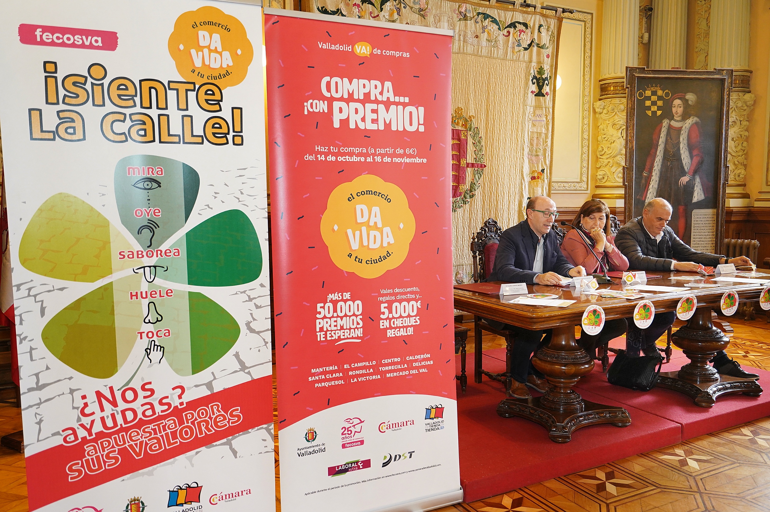 La concejala de Educación, Infancia, Juventud e Igualdad, María Victoria Soto; el presidente de FECOSVA, Jesús Herreras; y el vicepresidente de la Cámara Oficial de Comercio, Servicios e Industria de Valladolid, Francisco Javier Labarga, han presentado hoy la acción "Siente la Calle" dentro de la campaña "El comercio da vida a tu ciudad".