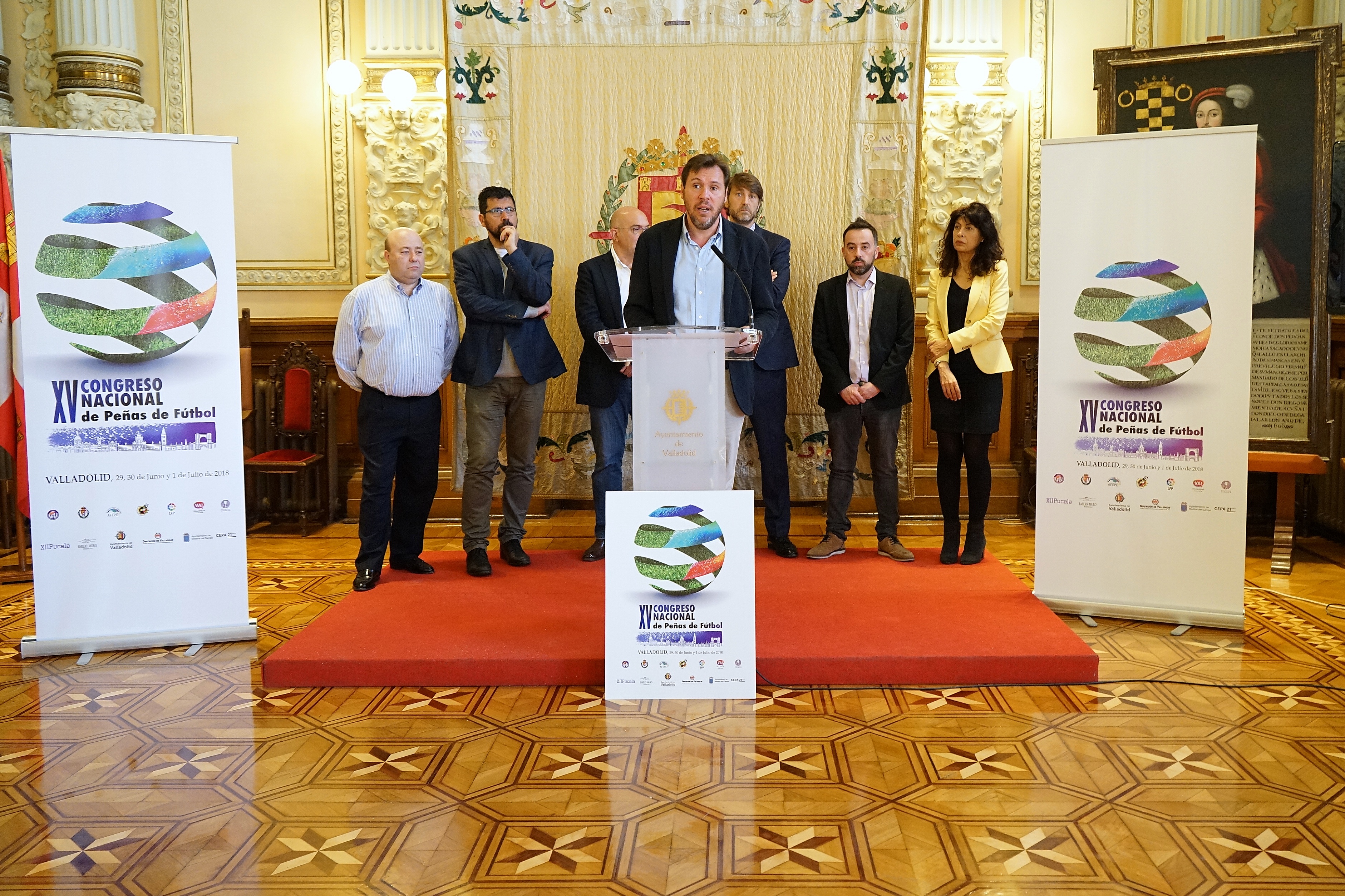 Durante la presentación, el regidor vallisoletano estuvo acompañado por el presidente de la Diputación de Valladolid, Jesús Julio Carnero, el presidente del Real Valladolid, Carlos Suárez, el secretario general de AFEPE, José Hidalgo, y el presidente de la Federación de Peñas del real Valladolid, José Antonio Pérez.