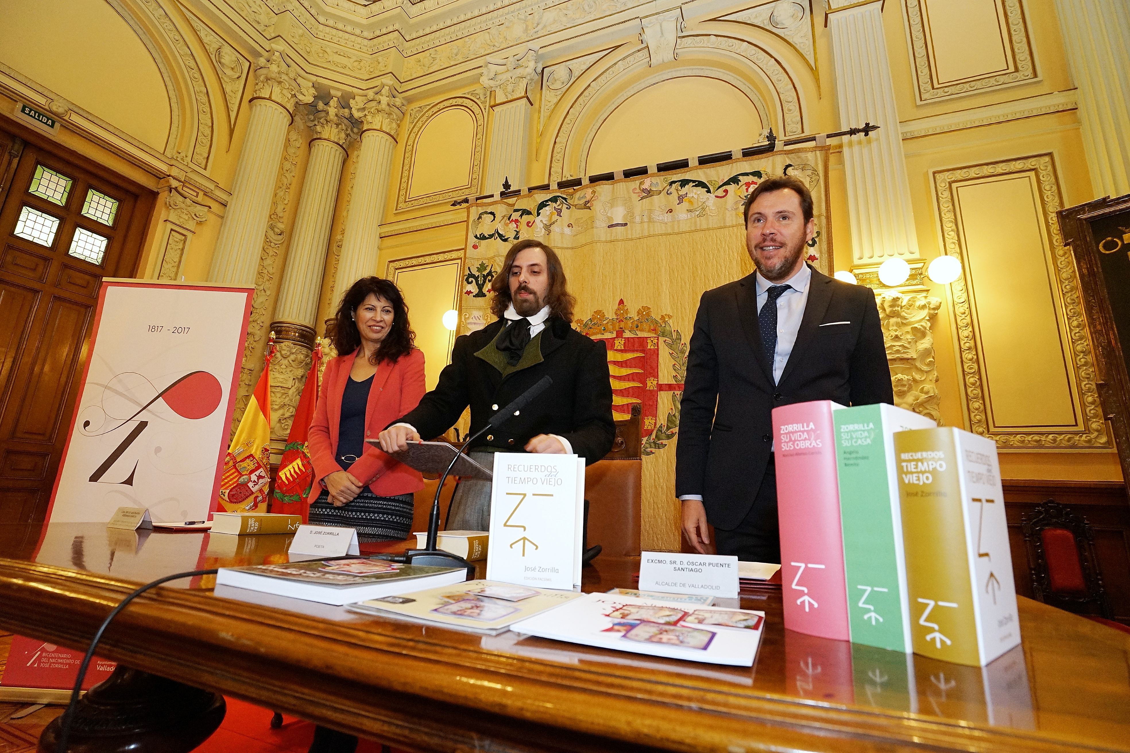 El alcalde de Valladolid, Óscar Puente Santiago; la concejala de Cultura y Turismo, Ana Redondo García; y "don José Zorrilla", encarnado por el actor Javier Calaveras, han presentado esta mañana la edición facsímil de las memorias de José Zorrilla: Recuerdos del tiempo viejo.