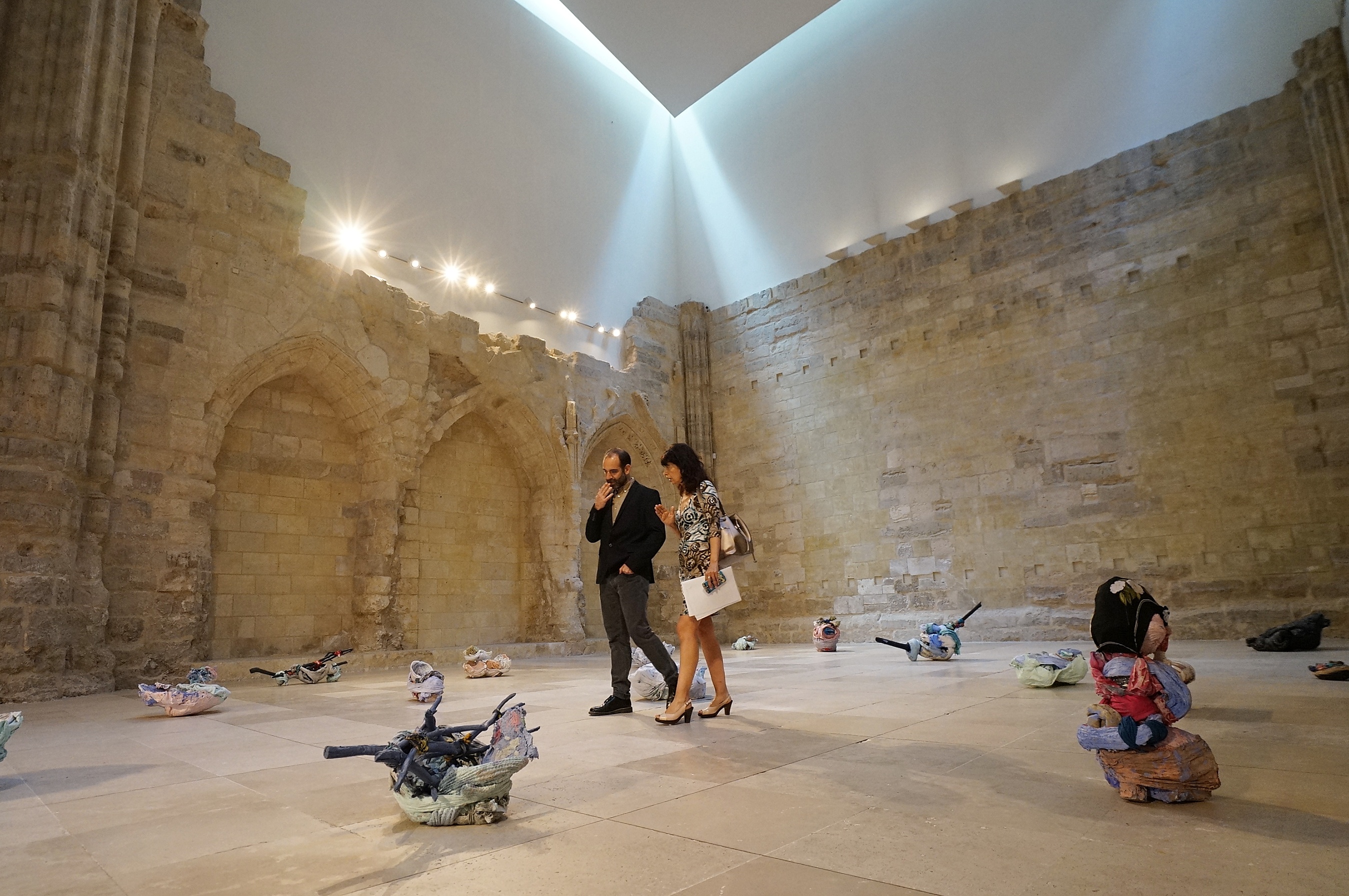 Otra mujer, Elena Aitkzoa, es la responsable del nuevo montaje expositivo realizado para la Capilla. Su trabajo tiende a ser enmarcado en el campo de la escultura, algo que no parece contradecir su intervención específica en la Capilla de los Condes de Fuensaldaña, uno de los espacios de exhibición más relevantes de nuestro país. Al fuerte componente formal que destila su obra se suma sin embargo un interés por la música y la poesía, que no actúan como meros vertebradores del material sino como elementos visibles y activos, como se desprende del talante performativo que gobierna toda su obra.
