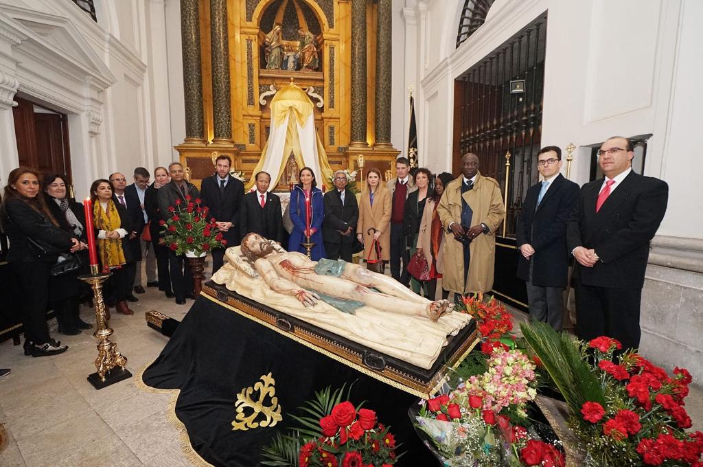 La ministra de Industria, Comercio y Turismo, Reyes Maroto, los máximos representantes en España de Guinea-Bissau (Paulo da Silva), Vietnam (Dung NgoTien), Bélgica (Marc Andries M.Calcoen), Moldavia (Violeta Agrici), Indonesia (Hermono Hermono), Nueva Zelanda (Nigel Donald Fyfe), India (Sanjav Verma), Turquía (Cihad Erginay), la ministra consejera de la embajada de Noruega (Torunn Viste) y el nuncio apostólico encargado de Negocios (Michael F. Crotty) han sido invitados por el Ayuntamiento de Valladolid para dsifrutar y conocer el Viernes Santo de la Semana Santa Vallisoletana.