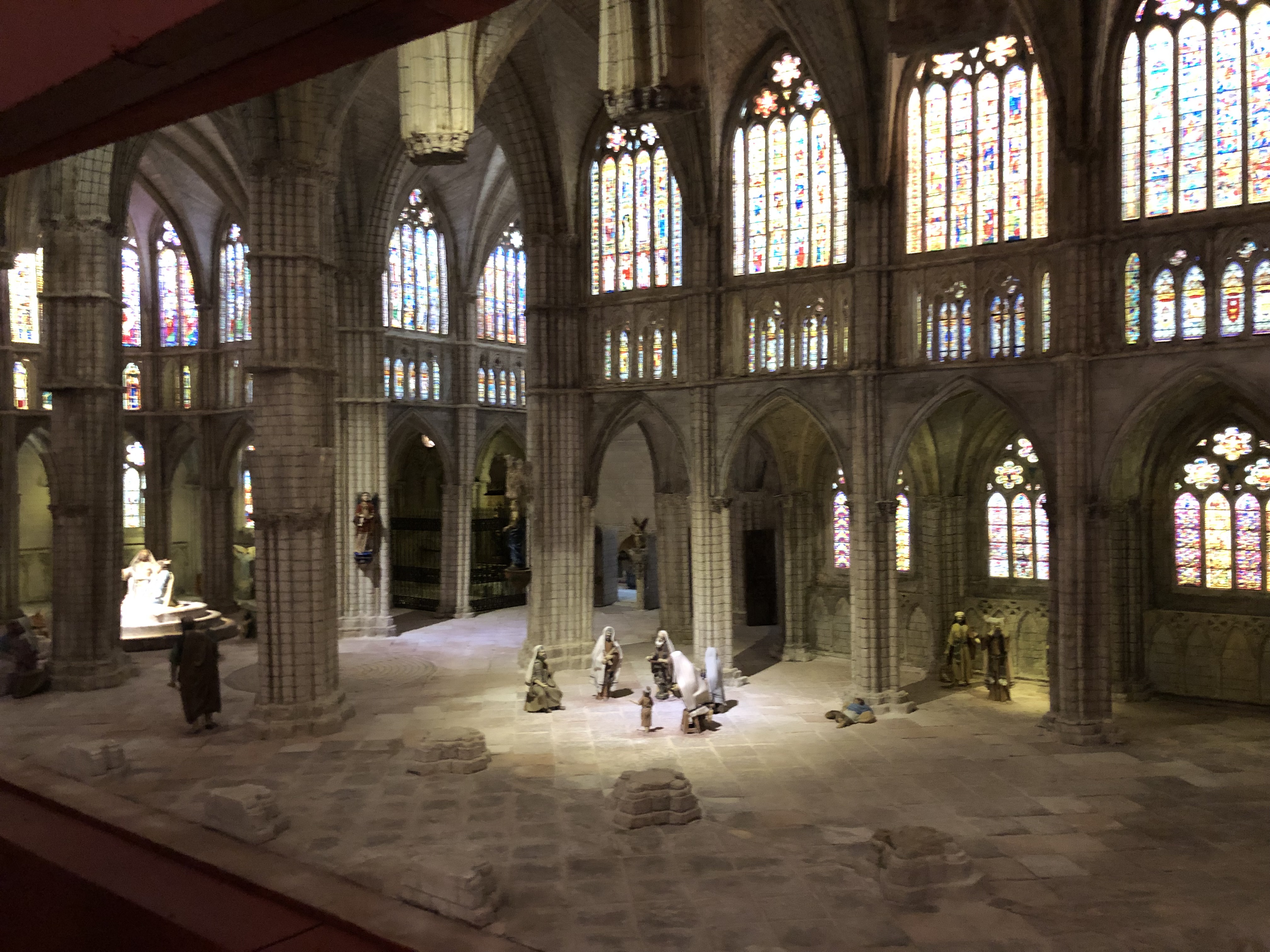 La Catedral de León, con una de las mejores colecciones de vidrieras medievales del mundo, cuidadosamente reproducidas en este montaje, es escenario de las principales escenas bíblicas asociadas al nacimiento de Cristo, como la Anunciación, la Natividad o la huida a Egipto. Además, la Asociación Belenista Castellana incluye en esta propuesta otras escenas menos habituales, como la presentación del niño ante el anciano Simeón o el niño entre doctores. La escenografía recrea, también, una plaza del mercado rodeada de tradicionales soportales castellanos.