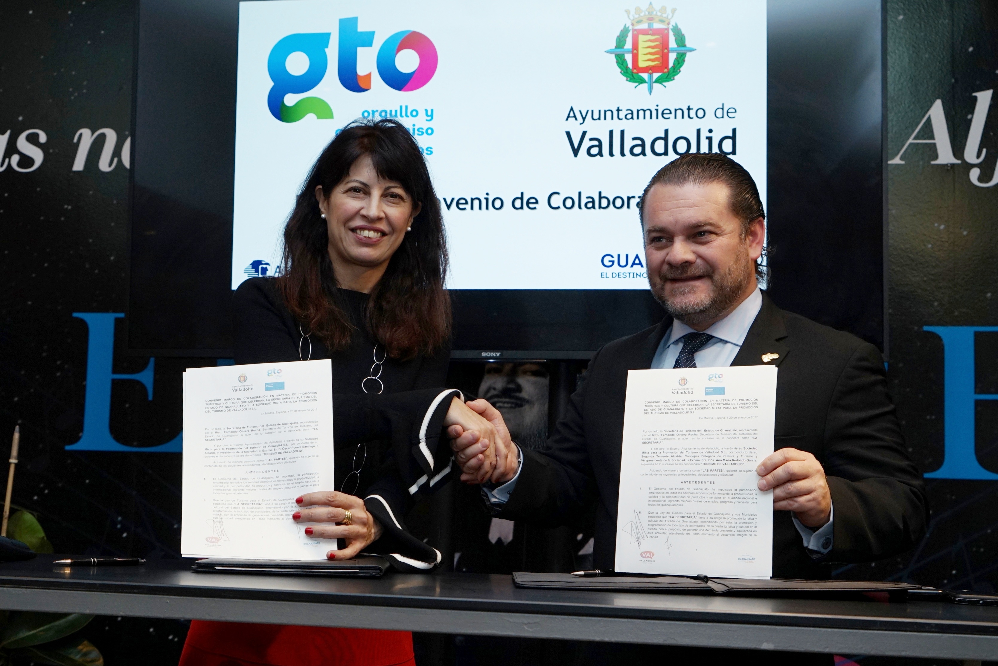 La concejala de Cultura y Turismo del Ayuntamiento de Valladolid, Ana María Redondo, en su condición de vicepresidenta de la Sociedad Mixta para la Promoción del Turismo de la ciudad, y el secretario de Turismo del Gobierno del Estado de Guanajuato, Fernando Olivera Rocha, han suscrito hoy, en Madrid, un "Convenio marco de colaboración en materia de promoción turística y cultural", con el fin de favorecer el intercambio y desarrollo de diferentes acciones de promoción en estos campos para mejorar el posicionamiento de la marca y la imagen de ambos destinos, todo lo cual contribuirá al incremento de turistas y al beneficio de las industrias del sector.