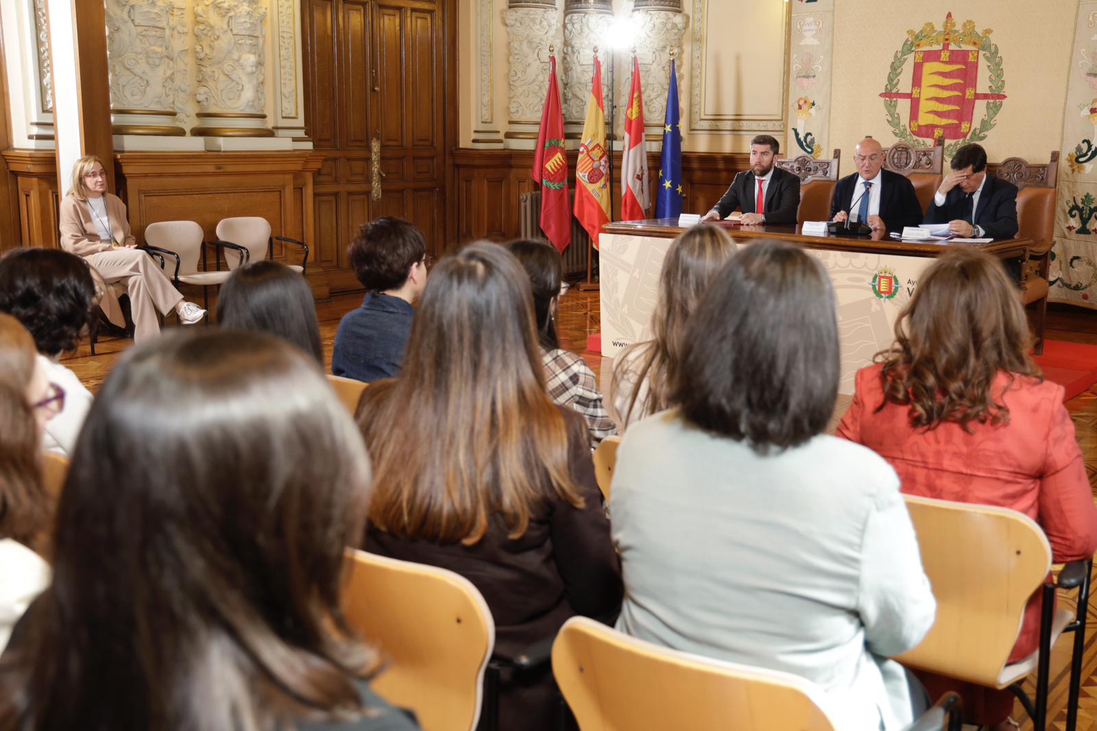 El alcalde, Jesús Julio Carnero, ha presidido la toma de posesión correspondiente a la convocatoria para la provisión de 39 puestos de auxiliar administrativo del Ayuntamiento de Valladolid, como funcionarios de carrera, de las Ofertas de Empleo Público de 2022, 2023 y 2024, pertenecientes a la Escala de Administración General, Subescala Auxiliar, Grupo C, Subgrupo C2 (sistema: oposición libre).