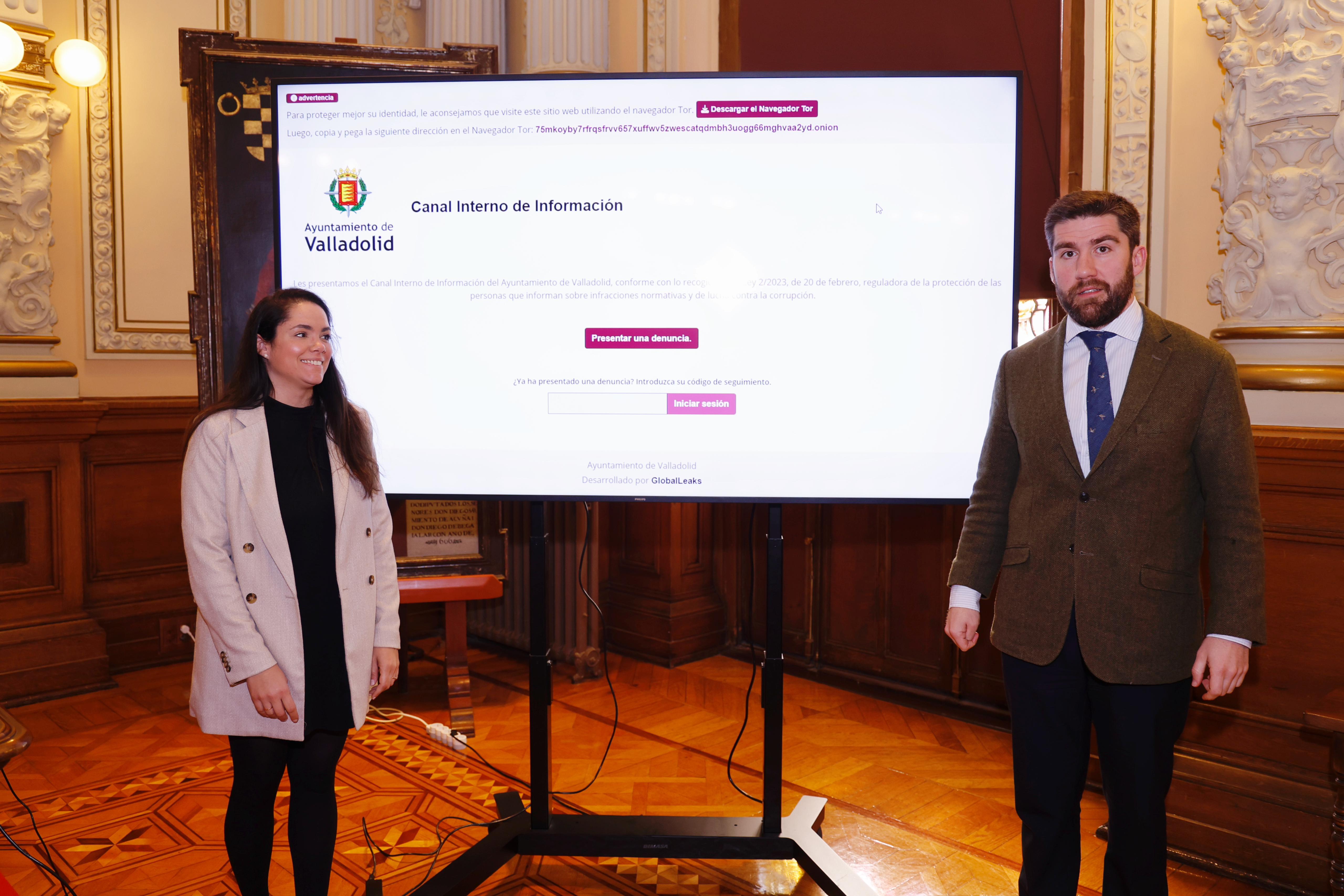 El concejal de Hacienda, Personal y Modernización Administrativa, Francisco Blanco, y la concejala delegada especial de Modernización Administrativa, Silvia Tomillo, han presentado hoy el ‘Sistema Interno de Información’ que el Ayuntamiento de Valladolid ha puesto en marcha al objeto de avanzar con su política de modernización de la Administración y dar cumplimiento a la normativa existente.