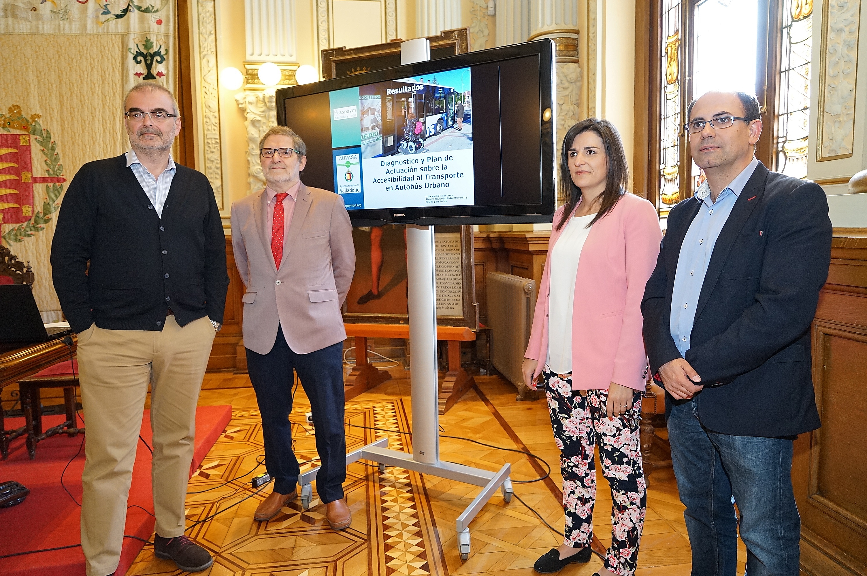 El concejal de Seguridad y Movilidad y presidente de AUVASA, Luis Vélez; junto al gerente de la empresa Andrés Bernabé; el gerente de ASPAYM Castilla y León, Julio Herrero, y la responsable de Accesibilidad de ASPAYM, Lidia Martín, ha presentado el "Diagnóstico y Plan de Actuación sobre la Accesibilidad al transporte público en los autobuses urbanos de Valladolid".