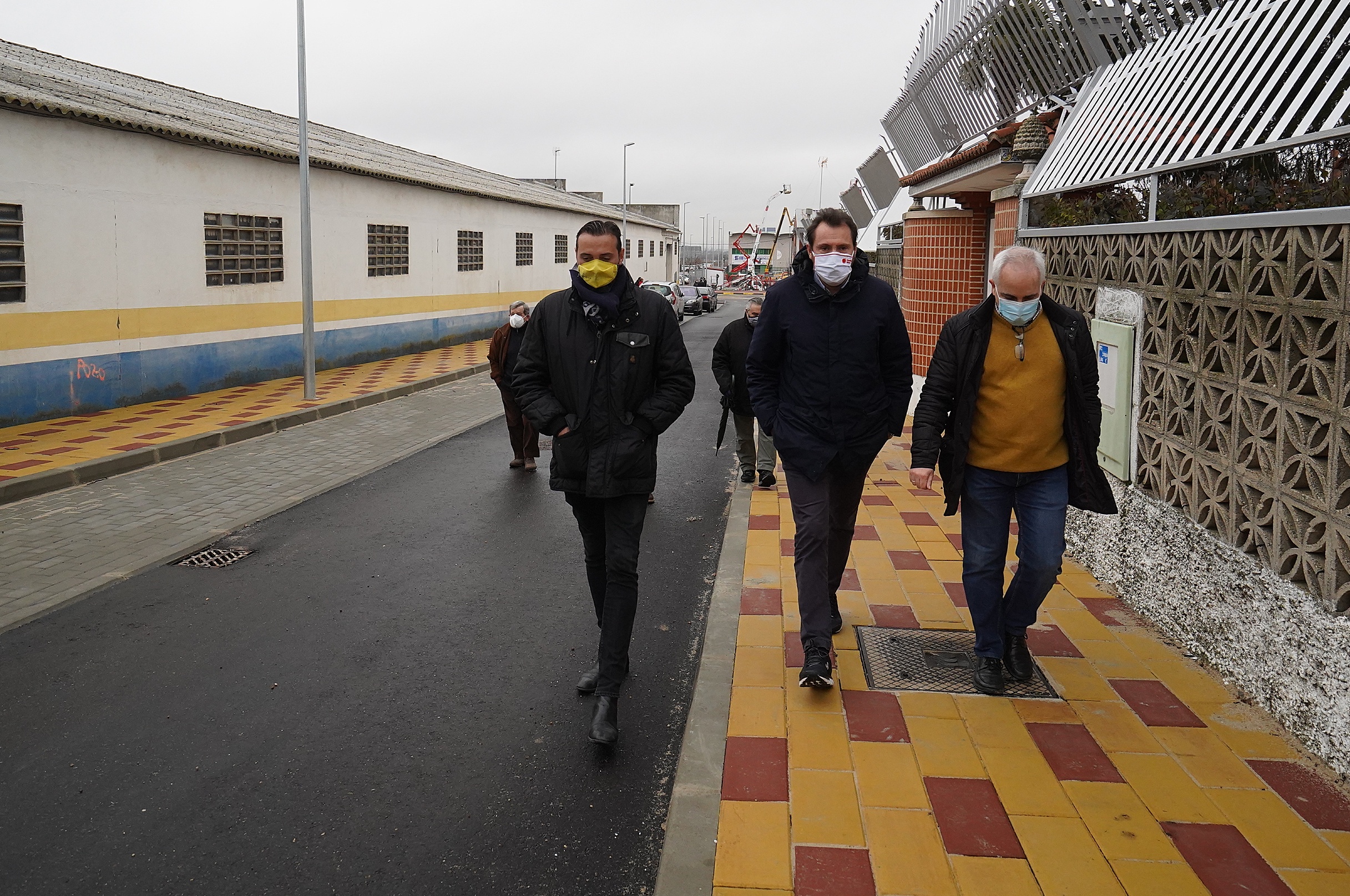 El alcalde de Valladolid, Oscar Puente, junto con el concejal de Movilidad y Espacio Urbano, Luis Vélez, y el jefe del Servicio de Espacio Público e Infraestructuras, acompañados por representantes de la Asociación Vecinal "Los Almendros", del barrio de Las Flores, han visitado la finalización de las obras de reurbanización de la calle Aralia.
