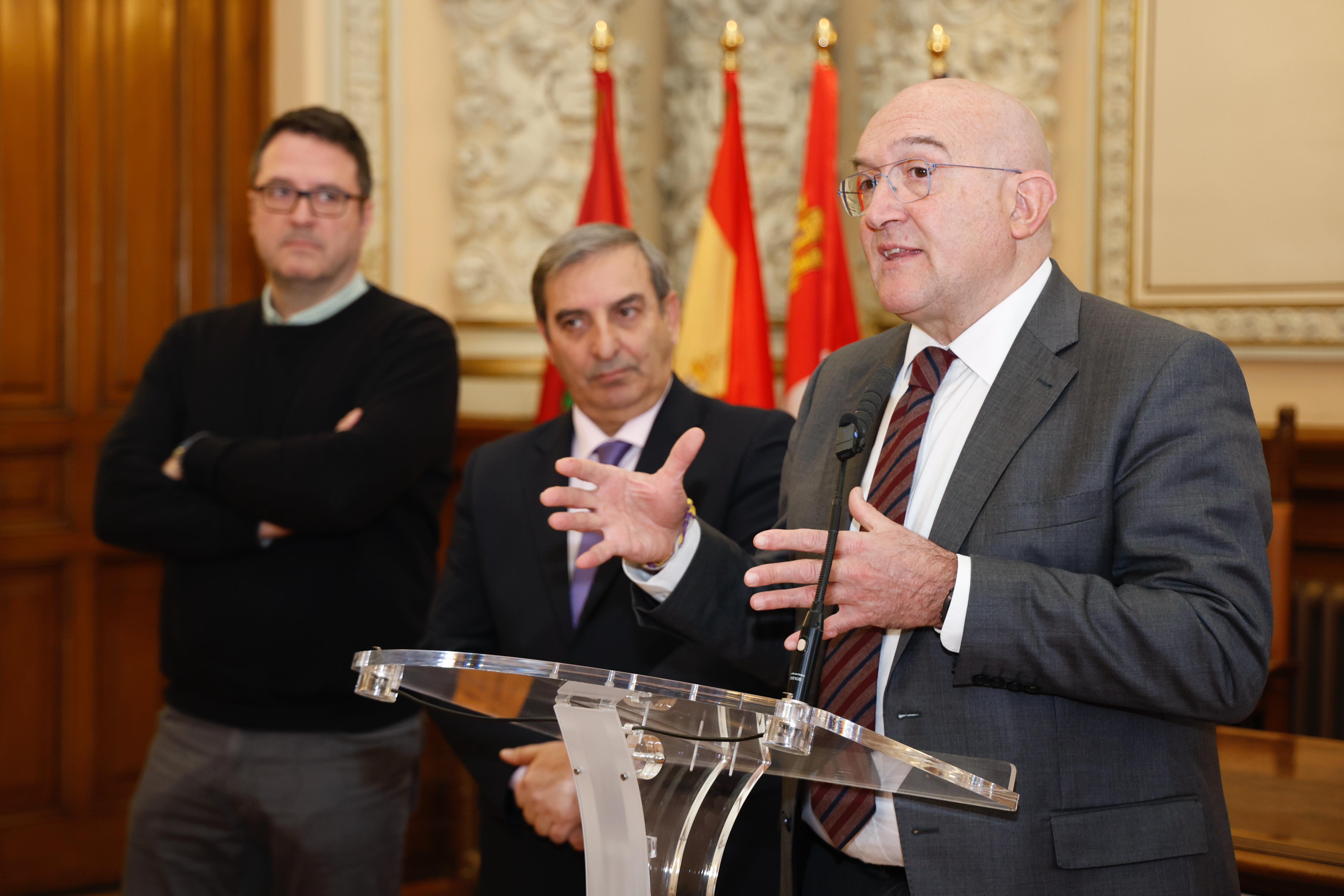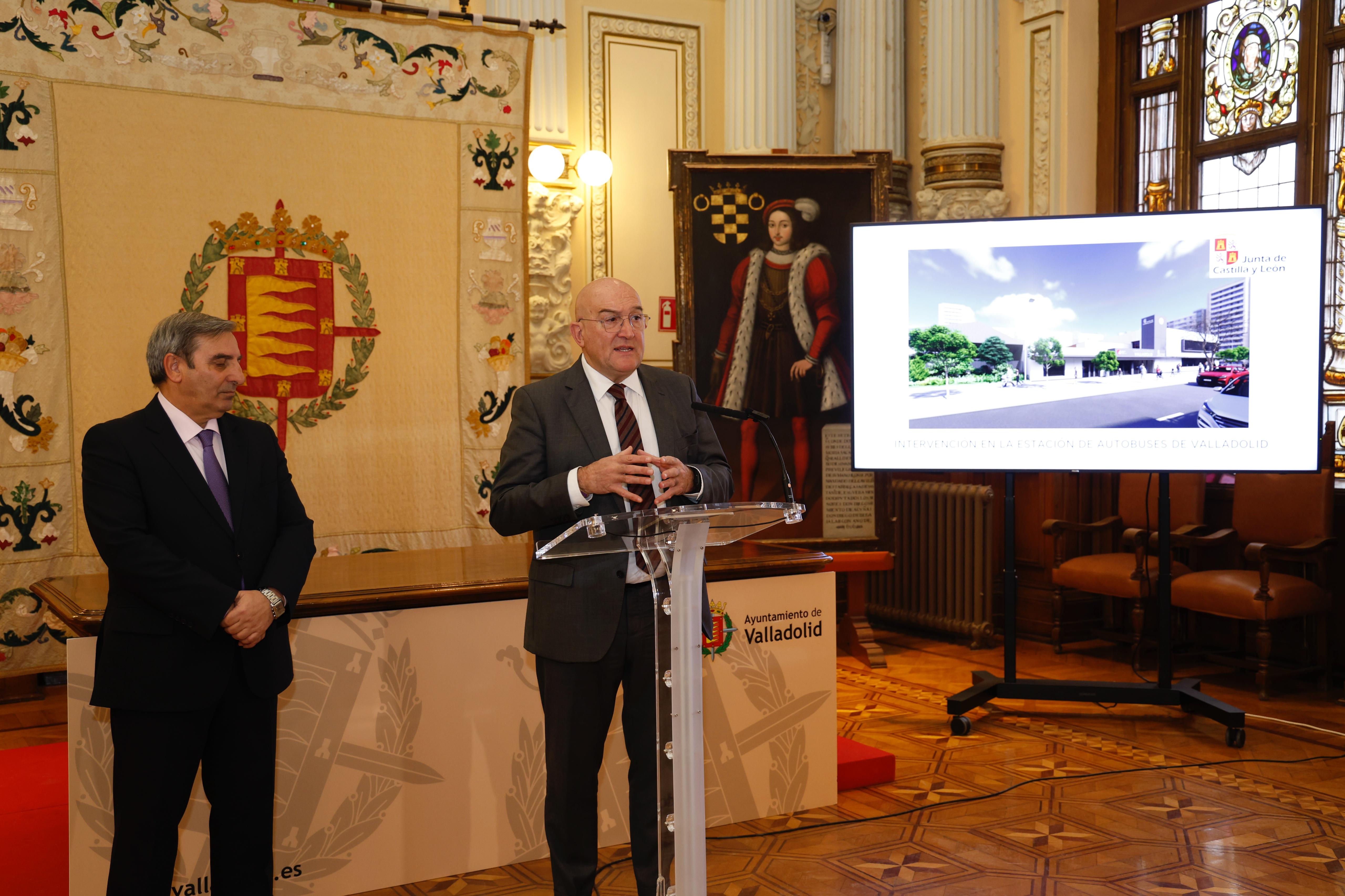 El alcalde de Valladolid, Jesús Julio Carnero, junto al consejero de Movilidad y Transformación Digital, José Luis Sanz Merino, han presentado hoy en el Ayuntamiento las obras de acondicionamiento y reforma de la estación de autobuses que se iniciarán una vez esté adjudicada la obra. La intervención ascenderá a 5 millones de euros.