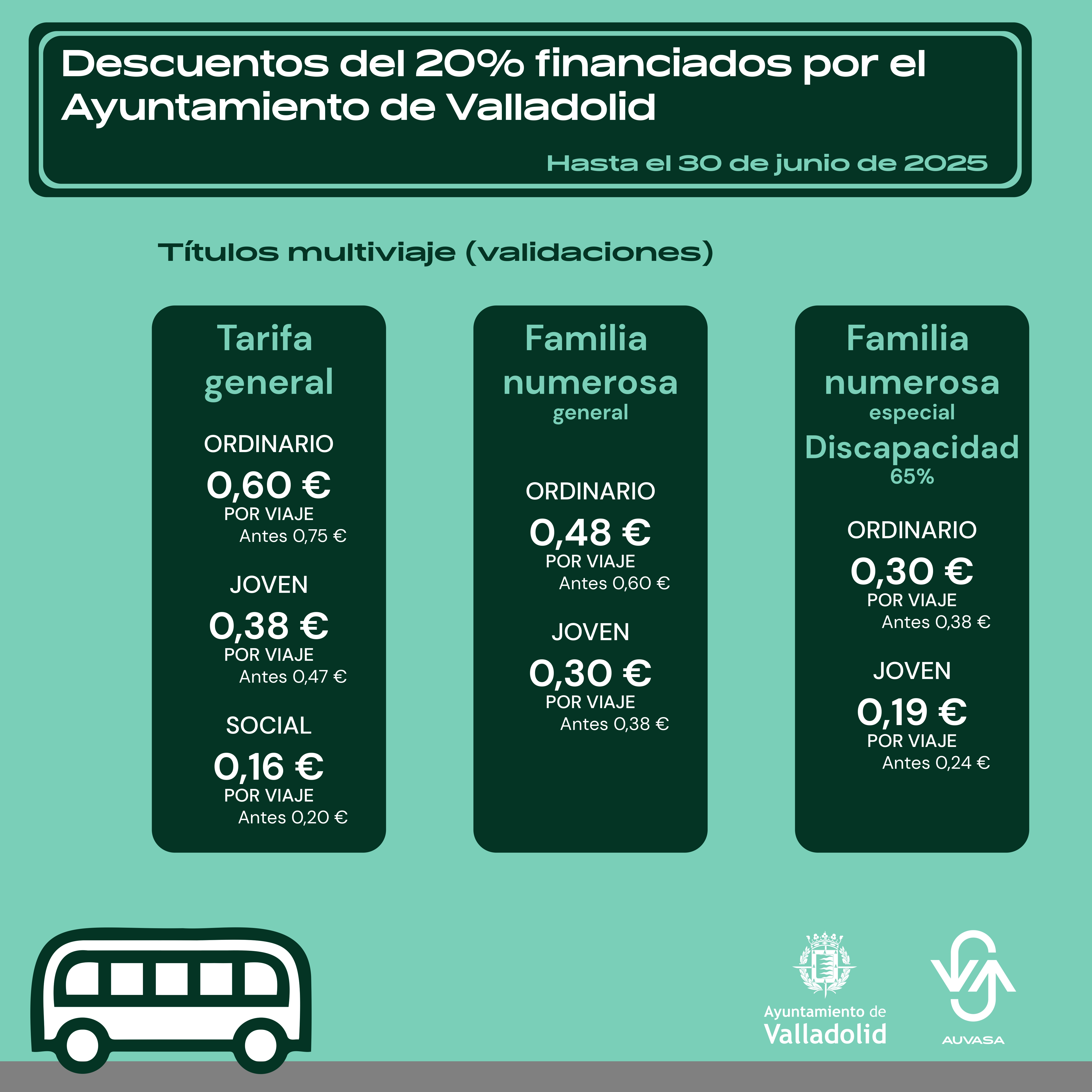 El Ayuntamiento de Valladolid, ha dado traslado a AUVASA del Acuerdo de la Junta de Gobierno Local para que aplique la nueva situación de las bonificaciones a partir de mañana 28 de enero, una vez conocida la eliminación de la aportación del Estado. En consecuencia, se continuará con la bonificación del Ayuntamiento de Valladolid del 20%, como venía haciendo desde el 1 de enero de este año.