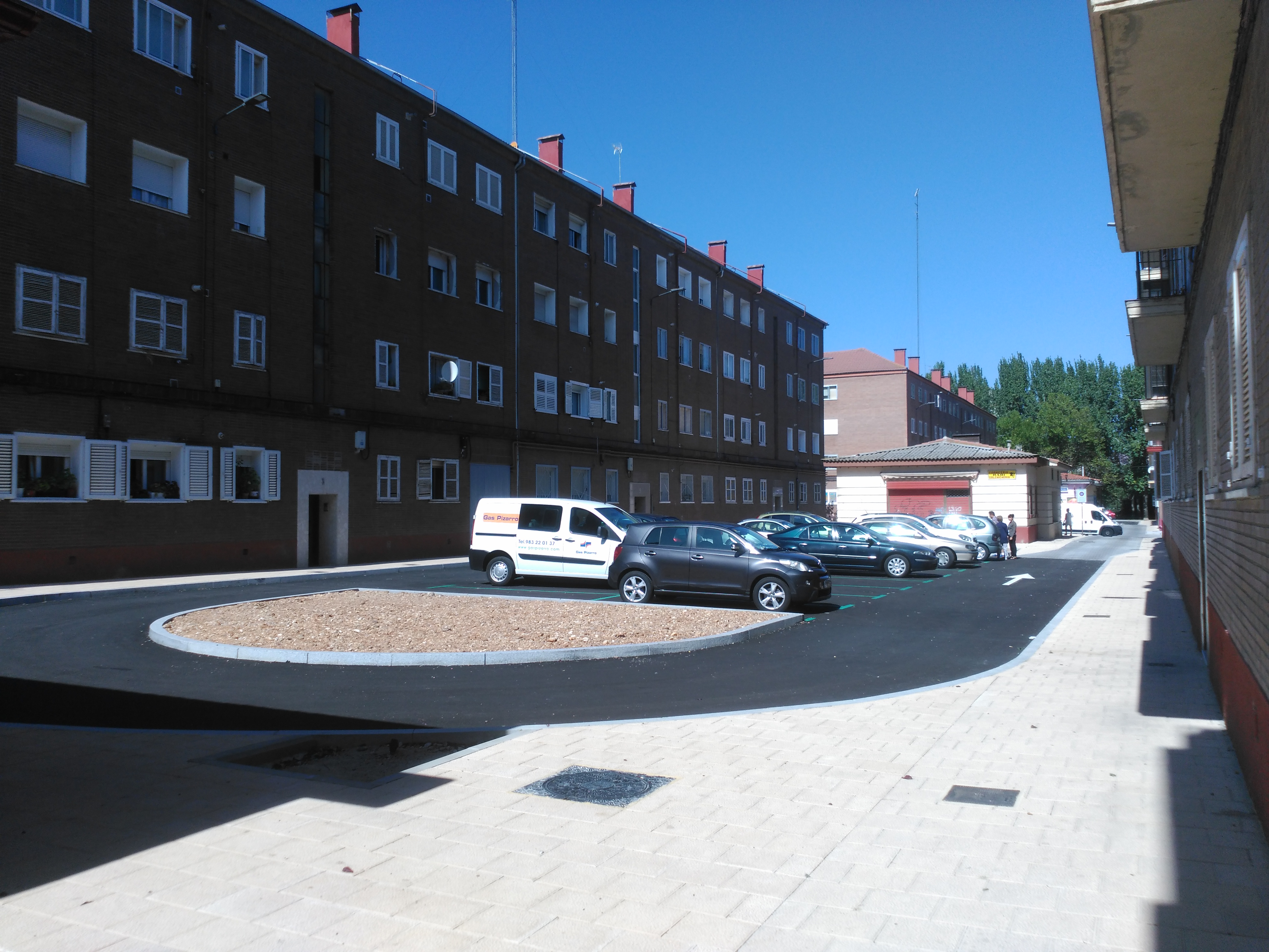 Ayer, 31 de agosto de 2017, se han dado por concluidos los trabajos de reurbanización de la calle de Pizarro por parte de la contrata de conservación de las vías públicas. Se trata de una "calle-patio" entre bloques de viviendas, con un tráfico muy residual y utilizada fundamentalmente como acceso a las viviendas y estacionamiento exclusivo de sus residentes. Con la actuación que ha terminado se ha pretendido reforzar ese carácter, cortando físicamente el tráfico pasante a lo largo de los dos tramos de la calle y dejándola con acceso rodado exclusivamente desde la avenida de los Reyes Católicos, para impedir que sea empleada para atajar en itinerarios largos, manteniendo la totalidad de las plazas de estacionamiento para uso exclusivo de residentes y amabilizando el espacio con la plantación de arbolado y la dotación de mobiliario.