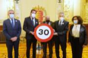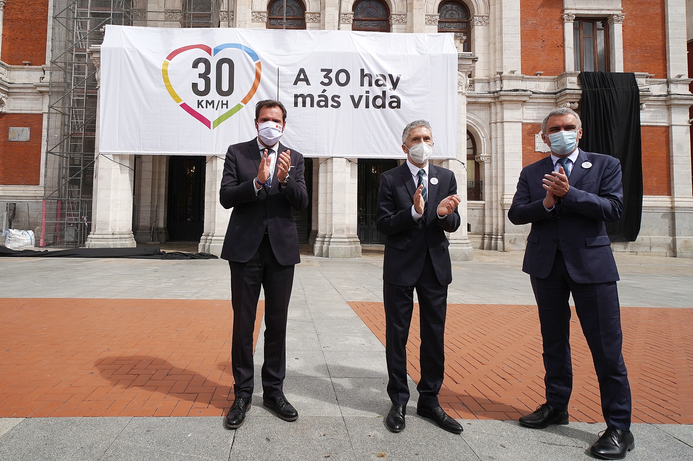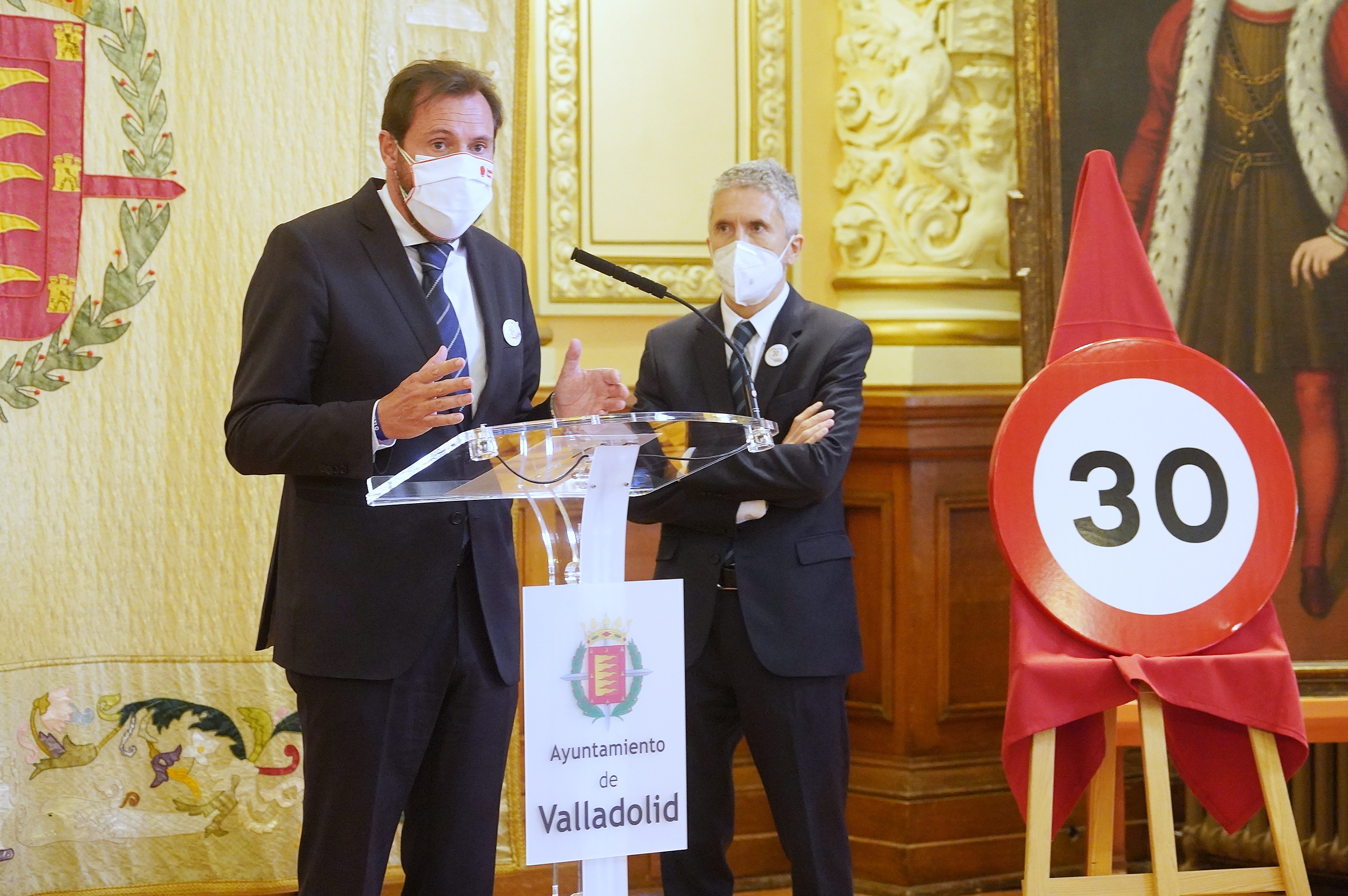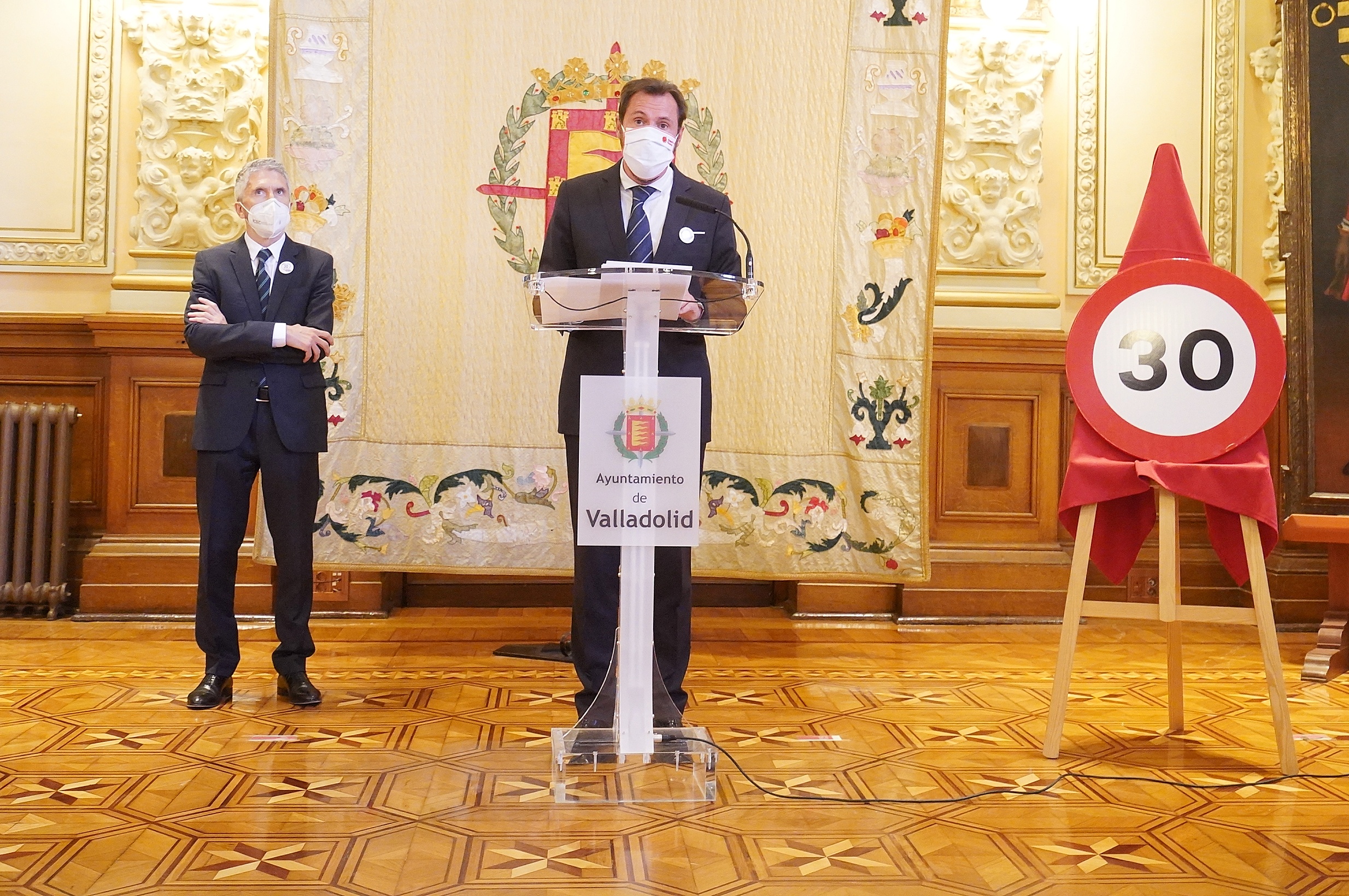 El ministro del Interior ha justificado la elección de Valladolid para presentar la reforma legal que limita la velocidad a 30 kilómetros por hora en las calles de un único carrril por sentido porque "es una de las ciudades españolas donde el concepto de movilidad sostenible y segura venía siendo una práctica desde hace tiempo". El alcalde, Óscar Puente, ha agradecido esta decisión del Gobierno de España porque supone un espaldarazo a las medidas que implican un cambio en la movilidad hacia un modelo más seguro y sostenible. "A 30 hay más vida" es el lema elegido para difundir este cambio, según se indica en la pancarta desplegada en la fachada de la Casa Consistorial.