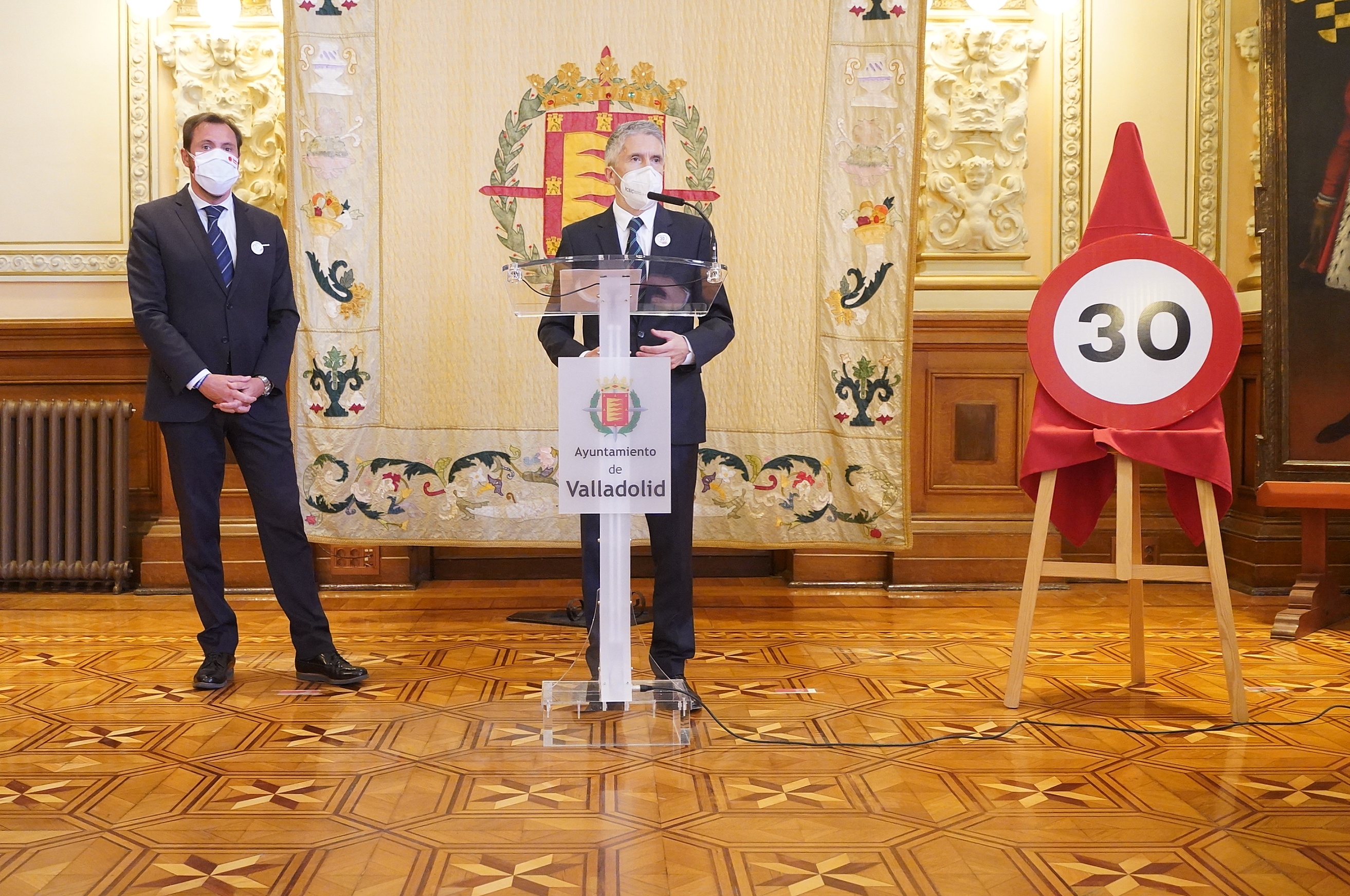 Grande-Marlaska ha acompañado este lunes al alcalde de Valladolid, Óscar Puente, en la presentación de la campaña informativa impulsada por la corporación municipal vallisoletana con motivo de la entrada en vigor de la limitación de la velocidad humana, campaña que se apoya en el eslogan elegido por la Dirección General de Tráfico con este mismo motivo: ‘A 30 hay más vida’.
