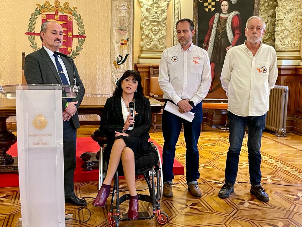 El concejal de Salud Pública y Seguridad Ciudadana, Alberto Cuadrado Toquero; la presidenta de la Asociación para el Estudio de la Lesión Modular Espinal (AESLEME), Mª Paz González Gallego; el delegado de la Fundación AVATA en Valladolid, Miguel Ángel Álvarez; el presidente de la Asociación de Motoclubes de Valladolid, Ángel González Somoza, y el agente de la Policía Local de Valladolid Aitor Martínez han presentado hoy los actos organizados con motivo de la conmemoración el próximo domingo, 19 de noviembre, del Día Mundial en Recuerdo de las Víctimas de Accidentes de Tráfico, que se celebrará desde las 12.00 de la mañana en la Plaza de Portugalete. Al acto ha asistido Juan Manuel González Becerra, intendente de la Policía Municipal de Valladolid.