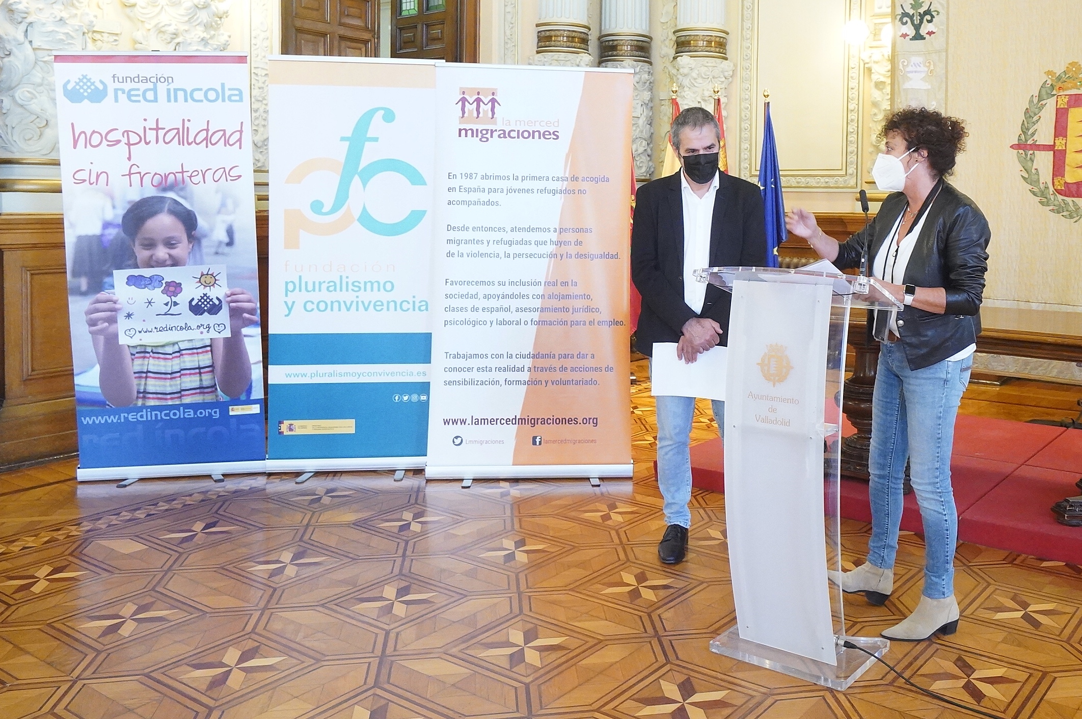 La concejala de Servicios Sociales y Mediación Comunitaria, Rafaela Romero, y la concejala delegada especial de Convivencia y Mediación Comunitaria, Carmen Jiménez, han presentado esta mañana la programación de Valladolid Plural acompañadas por el técnico de Programas e Incidencia de la Fundación Pluralismo y Convivencia, José Antonio Ranz; la subdelegada en Valladolid de Fundación La Merced Migraciones; el coordinador de Red Íncola, Eduardo Menchaca; y la pastora de la Iglesia Evangélica La Roca, Rosa Barrachina.