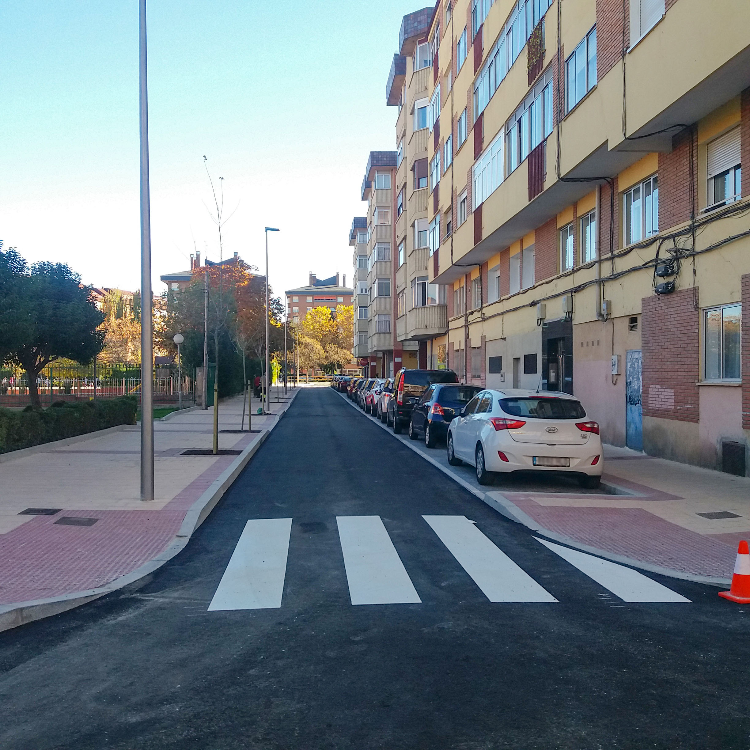 El aparcamiento en línea se ha pavimentado con adoquín prefabricado sobre base de hormigón y subbase de zahorra reciclada y las aceras con losas prefabricadas de terrazo tipo pétreo sobre subbase del mismo tipo de zahorra. Todos los nuevos bordillos son de granito, habiéndose renovado también los sumideros de recogida de pluviales, la señalización y mejorado el acceso rodado al aparcamiento de la parcela deportiva y peatonal al colegio elevando la cancela.