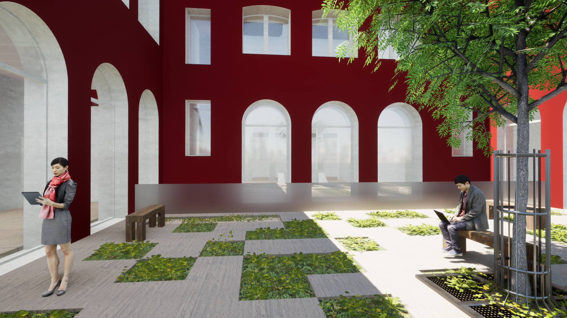 Además, el proyecto tiene una parte muy singular que es la creación de un ‘Ágora’ en planta sótano-primera recuperando la antigua estructura del patio del edificio, que se corona con una cubierta verde y estancial.