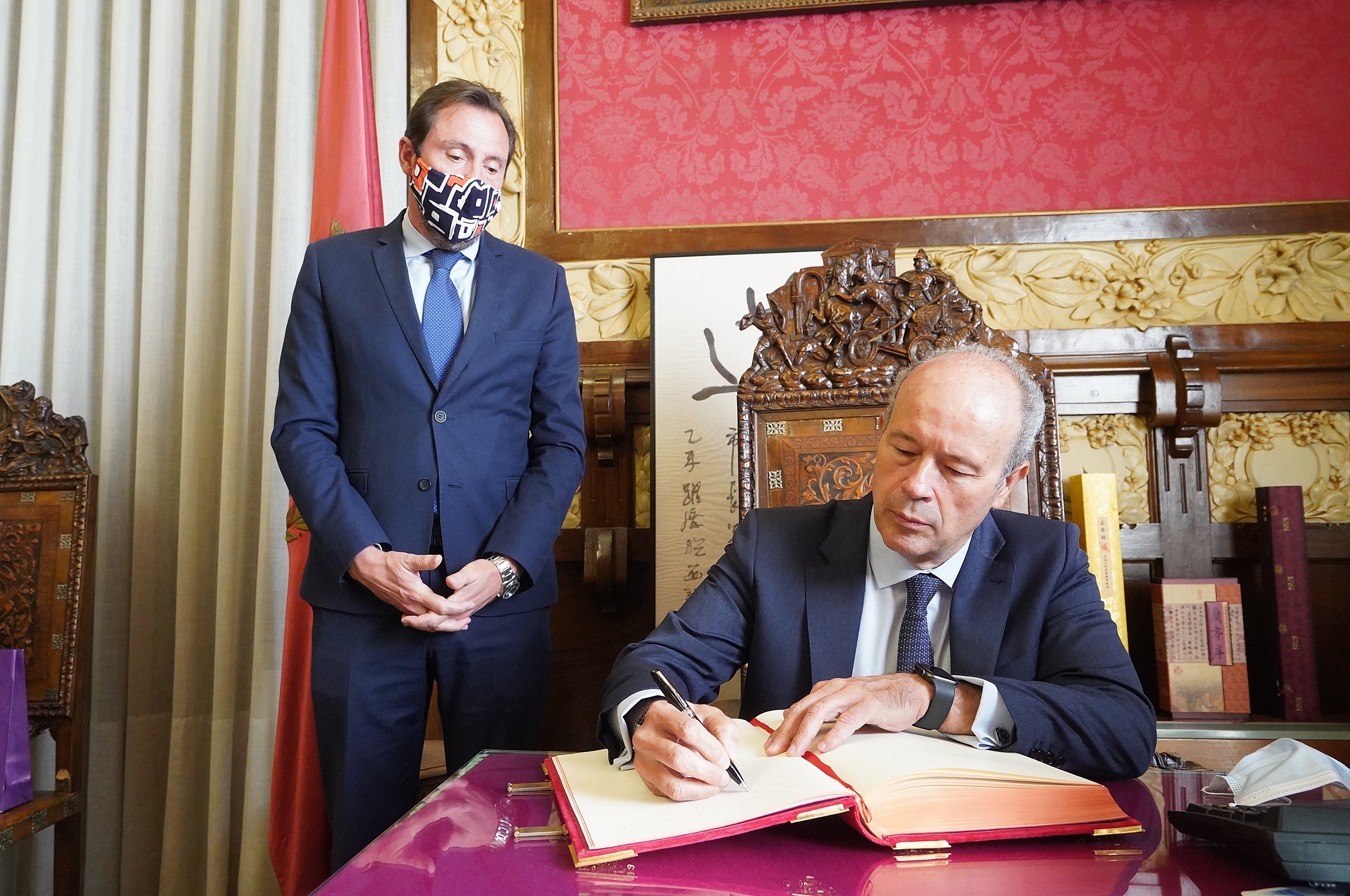 "Un día histórico, emotivo". Así ha calificado el ministro de Justicia, Juan Carlos Campo, este 7 de abril de 2021, día en el que el Ayuntamiento de Valladolid ha comunicado que "el proyecto Ciudad de la Justicia ha entrado en su recta final y definitiva" con la puesta a disposición del Ministerio del colegio de El Salvador, epicentro de la Ciudad de la Justicia. El anuncio lo ha hecho el alcalde, Óscar Puente, en la comparecencia conjunta con el ministro y el concejal de Planeamiento Urbanístico y Vivienda, Manuel Saravia. Al acto celebrado en el salón de recepciones también han asistido altos cargos del Ministerio; el delegado del Gobierno en Castilla y León, Javier Izquierdo; el subdelegado en Valladolid, Emilio Álvarez; el presidente de la Audiencia Provincial de Valladolid , Javier Carranza, y la fiscal jefe, Soledad Martín Nájera.