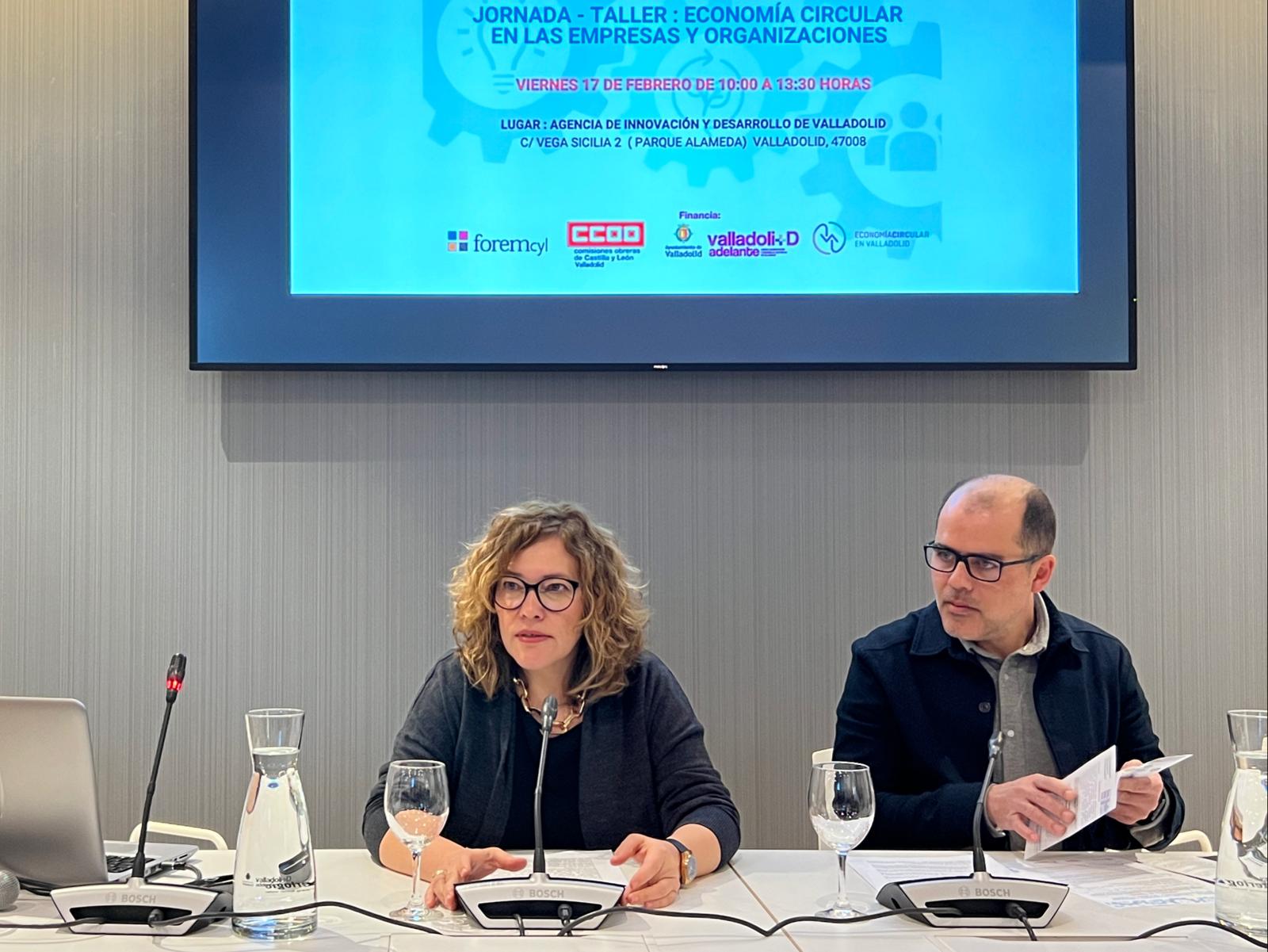 La concejala de Innovación, Desarrollo Económico, Empleo y Comercio Charo Chávez, y el delegado de CCOO de Valladolid Raúl García Agudo, han sido los encargados de abrir una jornada de formación para empresas que cierra un ciclo de aprendizaje sobre economía circular. En la jornada de trabajo se han compartido los resultados y avances del acuerdo de colaboración para el fomento de la economía circular en el tejido productivo local.