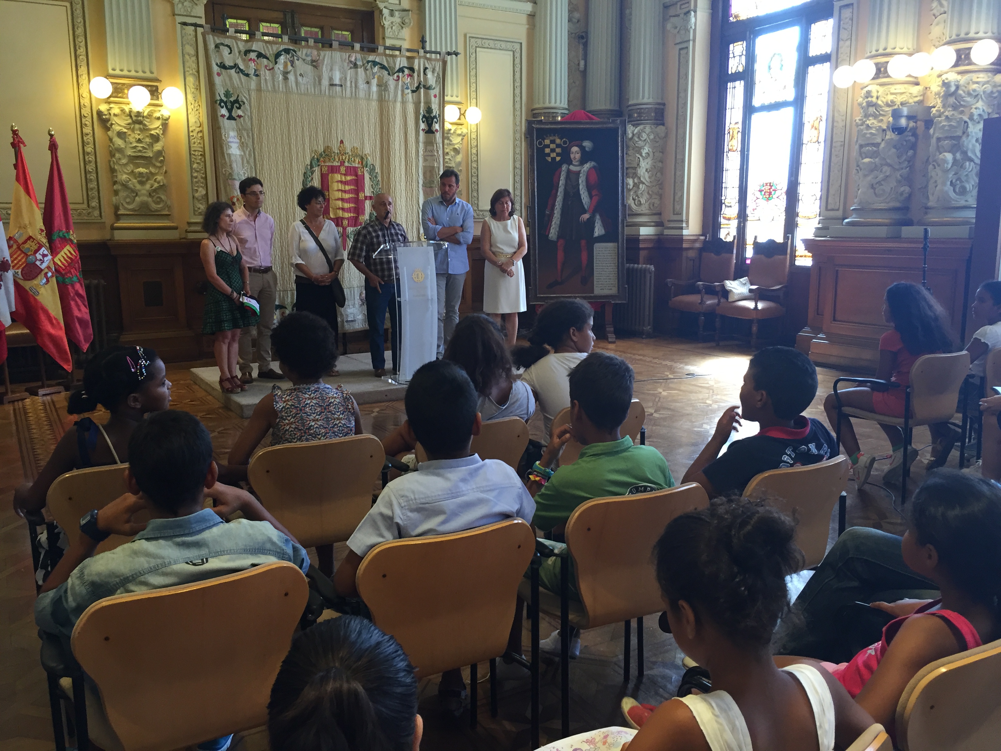 El alcalde de Valladolid, Oscar Puente, y las concejalas de Servicios Sociales, Rafaela Romero, y Educación, Infancia e Igualdad, Victoria Soto, dieron la bienvenida este jueves en el Ayuntamiento a los 35 niños del Sahara que llegan a la ciudad, acogidos por familias vallisoletanas, de la mano de la Asociación de Amigos del Pueblo Saharaui de Castilla y León.