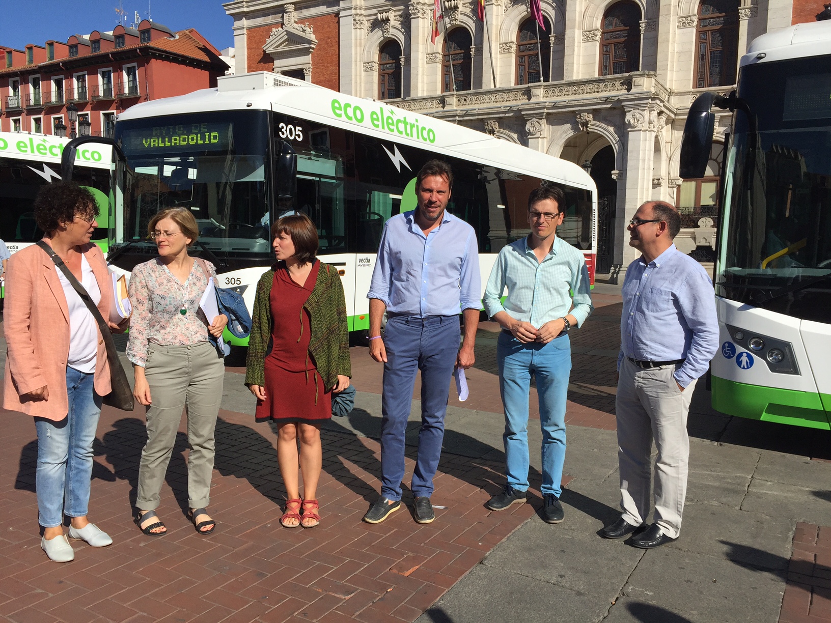 El alcalde de Valladolid y el concejal de Seguridad y Movilidad, Luis Vélez, acompañados de varios miembros de la Corporación, asistieron este martes a la presentación en la Plaza Mayor de tres nuevos vehículos híbridos diesel eléctricos que se incorporan a la flota de autobuses de AUVASA.