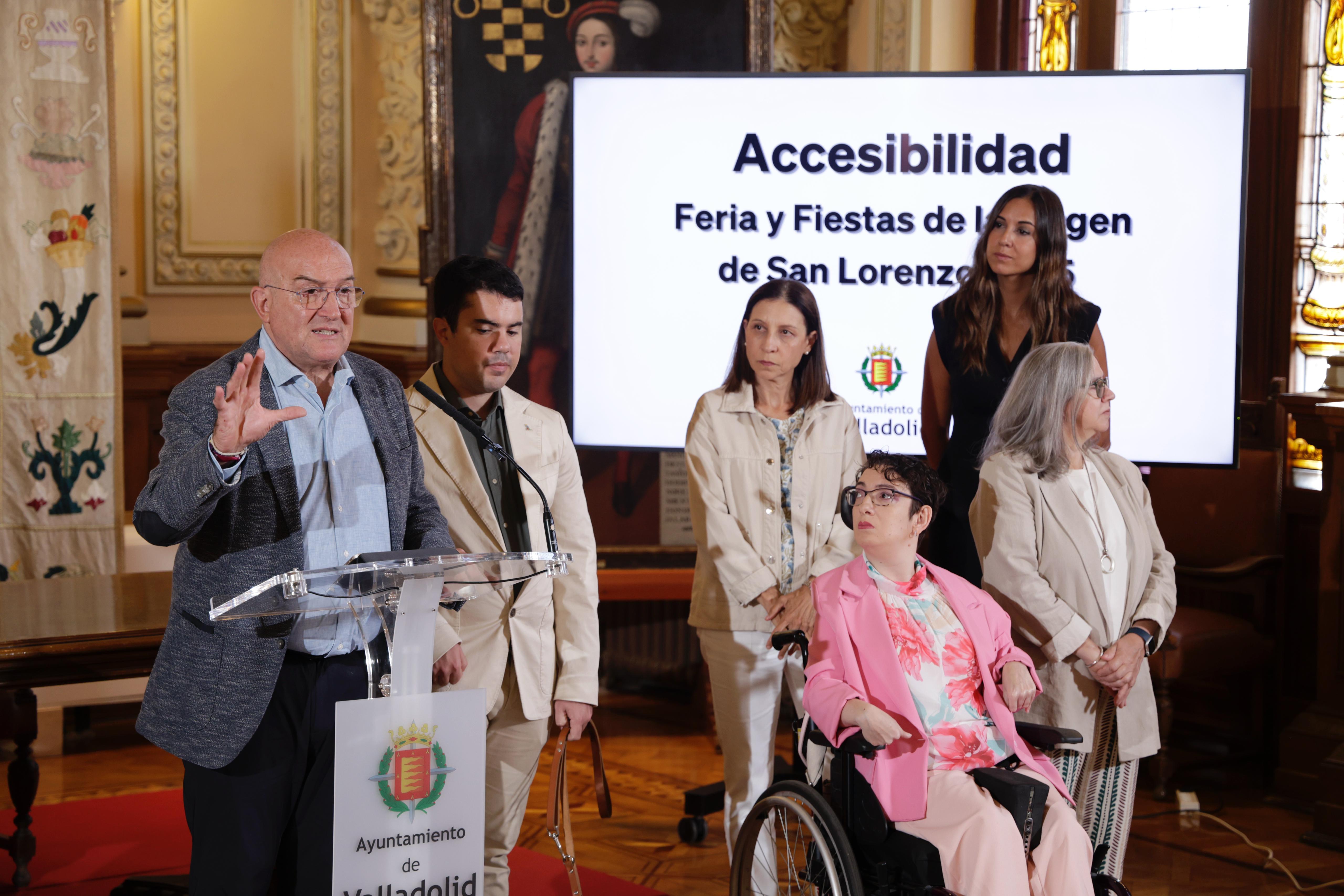 El alcalde de Valladolid, Jesús Julio Carnero, ha presentado hoy junto a la concejala de Turismo, Eventos y Marca Ciudad, Blanca Jiménez, y el concejal de Familia, Personas Mayores y Servicios Sociales, Rodrigo Nieto, las actuaciones en materia de accesibilidad que el Ayuntamiento ha implementado para la celebración del 25 aniversario de la Feria y Fiestas de la Virgen de San Lorenzo. Una serie de medidas y actividades organizadas para que todos los vecinos de la ciudad y visitantes puedan disfrutar de la festividad de la patrona.