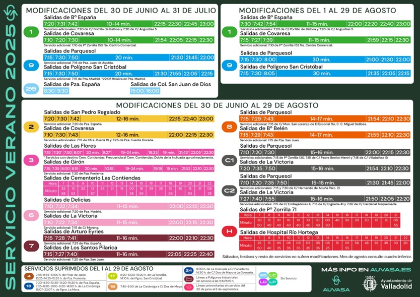 Las líneas lanzadera LC, LD y LP de los barrios de Covaresa, Delicias y Parquesol solamente prestarán servicio en el mes de julio, y las líneas universitarias suspenden el servicio del 30 de junio al 8 de septiembre.
